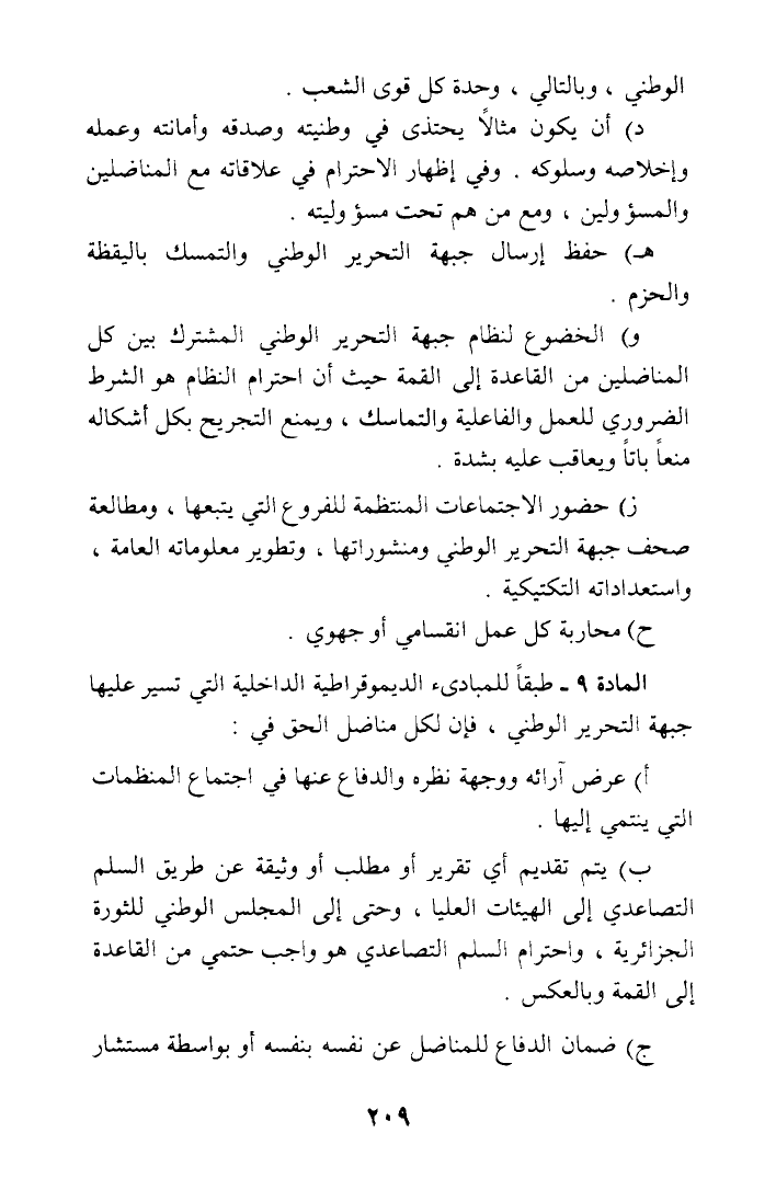 المادة 9 - طبقا للمبادىء الديموقراطية الداخلية التي تسير عليها جبهة التحرير الوطني، فإن لكل مناضل الحق في: