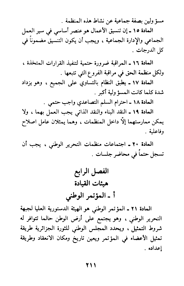المادة 21 - المؤتمر الوطني هو الهيئة الدستورية العليا لجبهة التحرير الوطني، وهو يجتمع على أرض الوطن حالما تتوافر له شروط التمثيل، ويحدد المجلس الوطني للثورة الجزائرية طريقة تمثيل الأعضاء في المؤتمر ويعين تاريخ ومكان الانعقاد وطريقة إعداده.