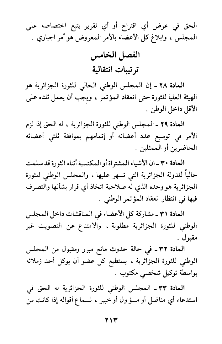 المادة 28 - إن المجلس الوطني الحالي للثورة الجزائرية هو الهيئة العليا للثورة حتى انعقاد المؤتمر، ويجب أن يعمل ثلثاه على