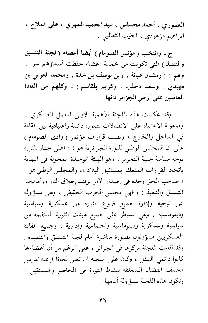 ج - وانتخب (مؤتمر الصومام) أيضا أعضاء (لجنة التنسيق والتنفيذ) التي تكونت من خمسة أعضاء حفظت أسماؤهم سرا، وهم: (رمضان عبانة، وبن يوسف بن خدة، ومحمد العربي بن مهيدي، وسعد دحلب، وكريم بلقاسم)، وكلهم من القادة العاملين على أرض الجزائر ذاتها.