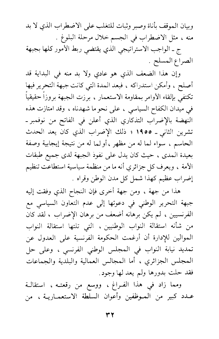 وإن هذا الضعف الذي هو عادي ولا بد منه في البداية قد أصلح، وأمكن استدراكه، فبعد المدة التي كانت جبهة التحرير فيها تكتفي بإلقاء الأوامر بمقاومة الاستعمار، برزت الجبهة بروزا حقيقيا في ميدان الكفاح السياسي، على نحو ما شهدناه، وقد امتازت هذه النهضة بالإضراب التذكاري الذي أعلن في الفاتح من نوفمبر - تشرين الثاني - 1955؛ ذلك الإضراب الذي كان يعد الحدث الحاسم، سواء لما له من مظهر، أو لما له من نتيجة إيجابية وصفة بعيدة المدى، حيث كان يدل على نفوذ الجبهة لدى جميع طبقات الأمة، ويعرف كل جزائري أنه ما من منظمة سياسية استطاعت تنظيم إضراب عظيم كهذا شمل كل مدن الوطن وقراه.