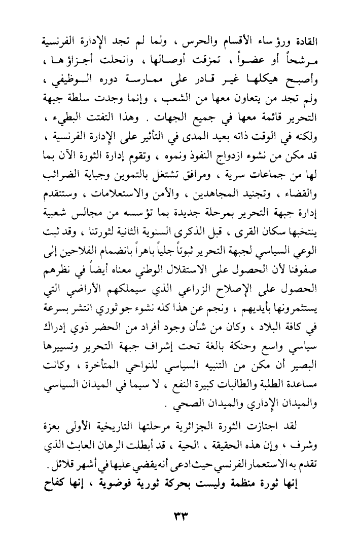 القادة ورؤساء الأقسام والحرس، ولما لم تجد الإدارة الفرنسية مرشحا أو عضوا، تمزقت أوصالها، وانحلت أجزاؤها، وأصبح هيكلها غير قادر على ممارسة دوره الوظيفي، ولم تجد من يتعاون معها من الشعب، وإنما وجدت سلطة جبهة التحرير قائمة معها في جميع الجهات وهذا التفتت البطيء، ولكنه في الوقت ذاته بعيد المدى في التأثير على الإدارة الفرنسية، قد مكن من نشوء ازدواج النفوذ ونموه، وتقوم إدارة الثورة الآن بما لها من جماعات سرية، ومرافق تشتغل بالتموين وجباية الضرائب والقضاء، وتجنيد المجاهدين، والأمن والاستعلامات، وستتقدم إدارة جبهة التحرير بمرحلة جديدة بما تؤسسه من مجالس شعبية ينتخبها سكان القرى، قبل الذكرى السنوية الثانية لثورتنا، وقد ثبت الوعي السياسي لجبهة التحرير ثبوتا جليا باهرا بانضمام الفلاحين إلى صفوفنا لأن الحصول على الاستقلال الوطني معناه أيضا في نظرهم الحصول على الإصلاح الزراعي الذي سيملكهم الأراضي التي يستثمرونها بأيديهم، ونجم عن هذا كله نشوء جو ثوري انتشر بسرعة في كافة البلاد، وكان من شأن وجود أفراد من الحضر ذوي إدراك سياسي واسع وحنكة بالغة تحت إشراف جبهة التحرير وتسييرها البصير أن مكن من التنبيه السياسي للنواحي المتأخرة، وكانت مساعدة الطلبة والطالبات كبيرة النفع، لا سيما في الميدان السياسي والميدان الإداري والميدان الصحي.