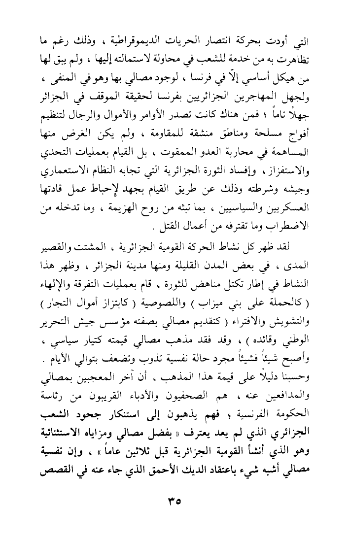 لقد ظهر كل نشاط الحركة القومية الجزائرية، المشتت والقصير المدى، في بعض المدن القليلة ومنها مدينة الجزائر، وظهر هذا النشاط في إطار تكتل مناهض للثورة، قام بعمليات التفرقة والإلهاء (كالحملة على بني ميزاب) واللصوصية (كابتزاز أموال التجار) والتشويش والافتراء (كتقديم مصالي بصفته مؤسس جيش التحرير الوطني وقائده)، وقد فقد مذهب مصالي قيمته كتيار سياسي، وأصبح شيئا فشيئا مجرد حالة نفسية تذوب وتضعف بتوالي الأيام. وحسبنا دليلا على قيمة هذا المذهب، أن آخر المعجبين بمصالي والمدافعين عنه، هم الصحفيون والأدباء القريبون من رئاسة الحكومة الفرنسية؛ فهم يذهبون إلى استنكار جحود الشعب الجزائري الذي لم يعد يعترف (بفضل مصالي ومزاياه الاستثنائية وهو الذي أنشأ القومية الجزائرية قبل ثلاثين عاما)، وإن نفسية مصالي أشبه شيء باعتقاد الديك الأحمق الذي جاء عنه في القصص