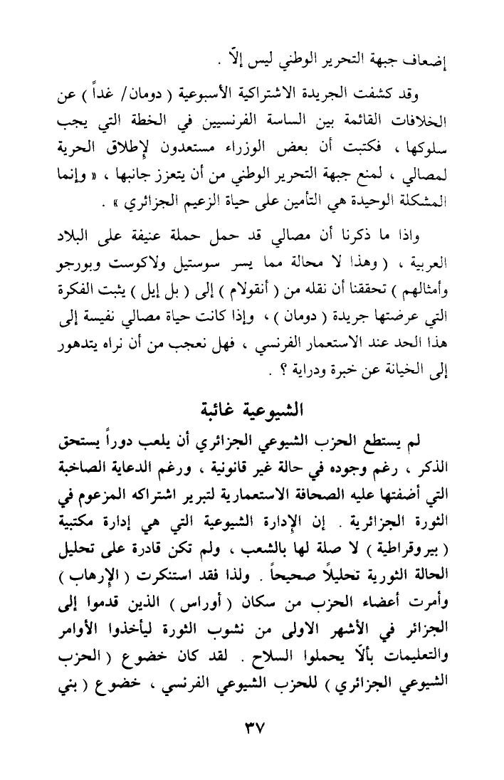 لم يستطع الحزب الشيوعي الجزائري أن يلعب دورا يستحق الذكر، رغم وجوده في حالة غير قانونية، ورغم الدعاية الصاخبة التي أضفتها عليه الصحافة الاستعمارية لتبرير اشتراكه المزعوم في الثورة الجزائرية. إن الإدارة الشيوعية التي هي إدارة مكتبية (بيروقراطية) لا صلة لها بالشعب، ولم تكن قادرة على تحليل الحالة الثورية تحليلا صحيحا. ولذا فقد استنكرت (الإرهاب) وأمرت أعضاء الحزب من سكان (أوراس) الذين قدموا إلى الجزائر في الأشهر الأولى من نشوب الثورة يأخذوا الأوامر والتعليمات بألا يحملوا السلاح. لقد كان خضوع (الحزب الشيوعي الجزائري) للحزب الشيوعي الفرنسي، خضوع (بني