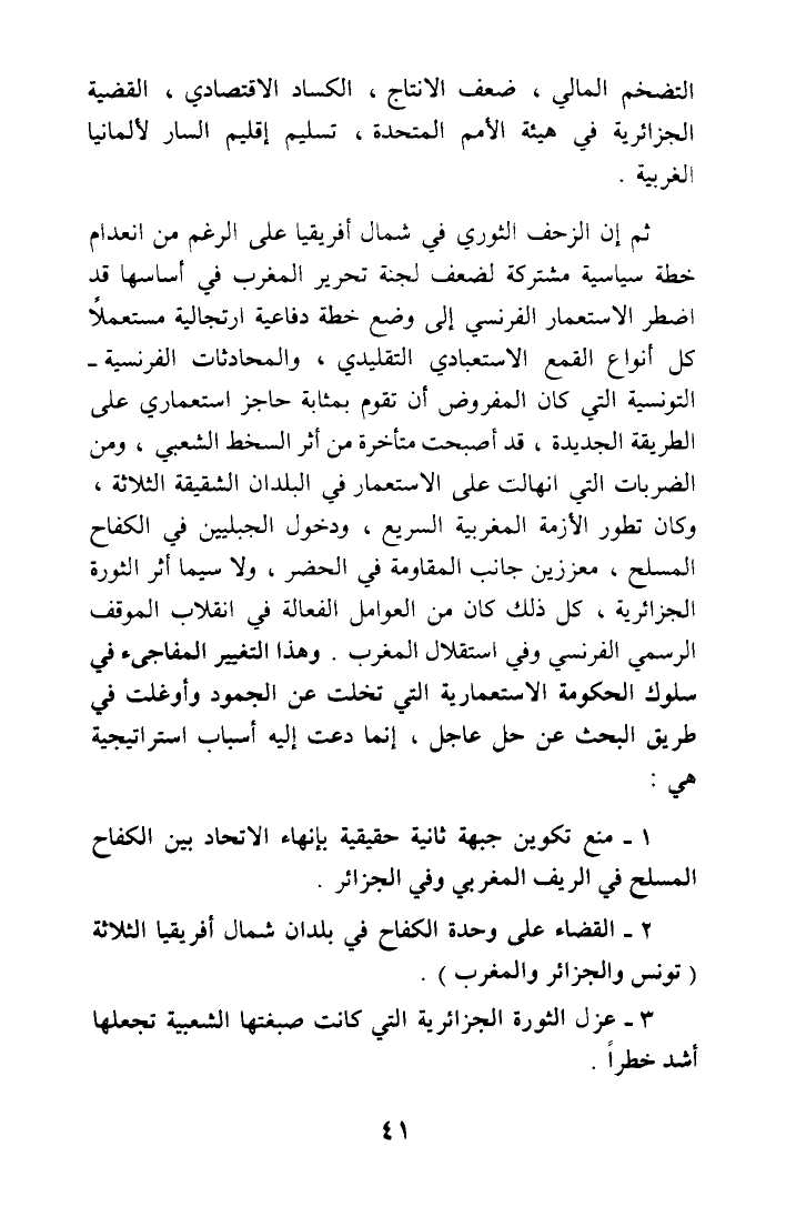 ثم إن الزحف الثوري في شمال أفريقيا على الرغم من انعدام خطة سياسية مشتركة لضعف لجنة تحرير المغرب في أساسها قد اضطر الاستعمار الفرنسي إلى وضع خطة دفاعية ارتجالية مستعملا كل أنواع القمع الاستعبادي التقليدي، والمحادثات الفرنسية - التونسية التي كان المفروض أن تقوم بمثابة حاجز استعماري على الطريقة الجديدة، قد أصبحت متأخرة من أثر الخط الشعبي، ومن الضربات التي انهالت على الاستعمار في البلدان الشقيقة الثلاثة، وكان تطور الأزمة المغربية السريع، ودخول الجبليين في الكفاح المسلح، معززين جانب المقاومة في الحضر، ولا سيما أثر الثورة الجزائرية، كل ذلك كان من العوامل الفعالة في انقلاب الموقف الرسمي الفرنسي وفي استقلال المغرب. وهذا التغيير المفاجىء في سلوك الحكومة الاستعمارية التي تخلت عن الجمود وأوغلت في طريق البحث عن حل عاجل، إنما دعت إليه أسباب استراتيجية هي: