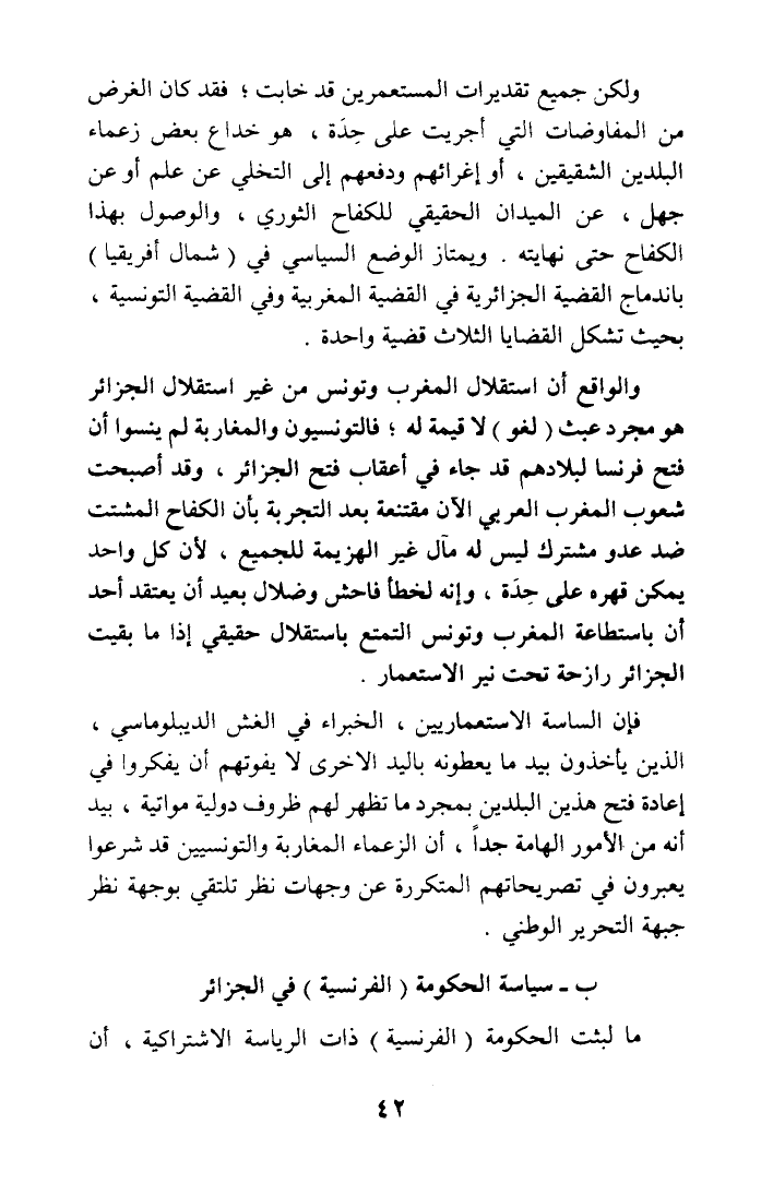 ولكن جميع تقديرات المستعمرين قد خابت؛ فقد كان الغرض من المفاوضات التي أجريت على حدة، هو خداع بعض زعماء البلدين الشقيقين، أو إغرائهم ودفعهم إلى التخلي عن علم أو عن جهل، عن الميدان الحقيقي للكفاح الثوري، والوصول بهذا الكفاح حتى نهايته. ويمتاز الوضع السياسي في (شمال أفريقيا) باندماج القضية الجزائرية في القضية المغربية وفي القضية التونسية، بحيث تشكل القضايا الثلاث قضية واحدة.
