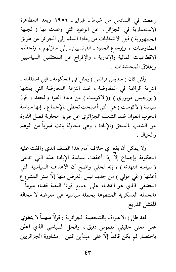 لقد ظل (الاعتراف بالشخصية الجزائرية) قولا مبهما لا ينطوي على معنى حقيقي ملموس دقيق، والحل السياسي الذي اعلن باختصار لم يكن قائما إلا على مبدأين اثنين: مشاورة الجزائريين