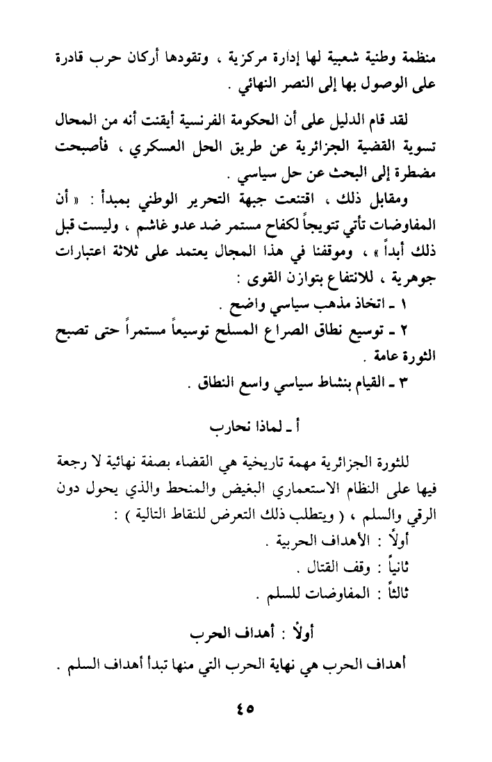 للثورة الجزائرية مهمة تاريخية هي القضاء بصفة نهائية لا رجعة فيها على النظام الاستعماري البغيض والمنحط والذي يحول دون الرقي والسلم، (ويتطلب ذلك التعرض للنقاط التالية):