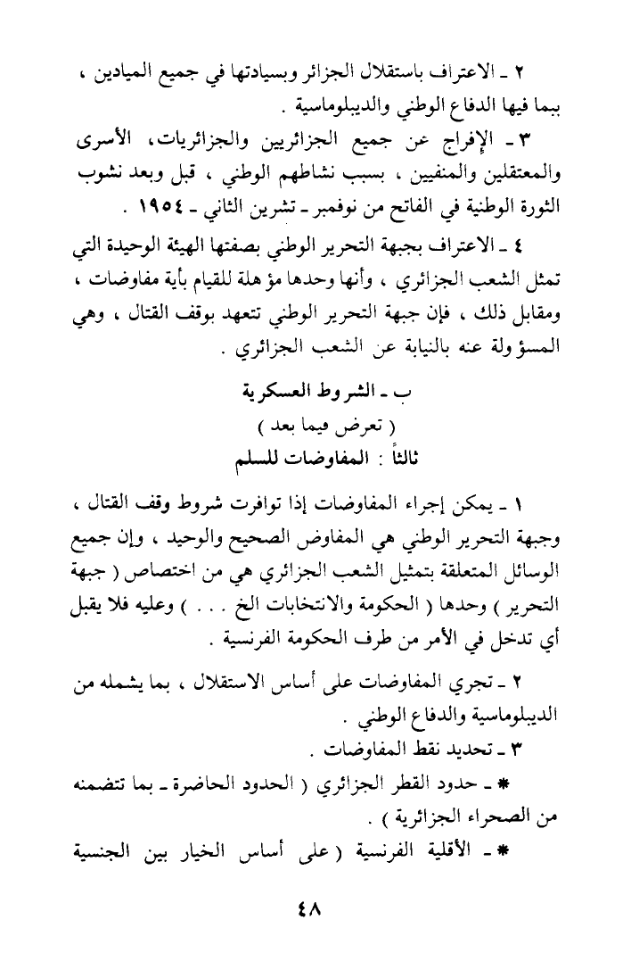 1 - يمكن إجراء المفاوضات إذا توافرت شروط وقف القتال، وجبهة التحرير الوطني هي المفاوض الصحيح والوحيد، وإن جميع الوسائل المتعلقة بتمثيل الشعب الجزائري هي من اختصاص (جبهة التحرير) وحدها (الحكومة والانتخابات الخ ...) وعليه فلا يقبل أي تدخل في الأمر من طرف الحكومة الفرنسية.