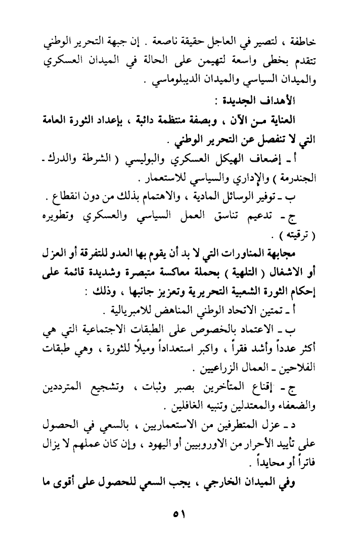 العناية من الآن، وبصفة منتظمة دائبة، بإعداد الثورة العامة التي لا تنفصل من التحرير الوطني.