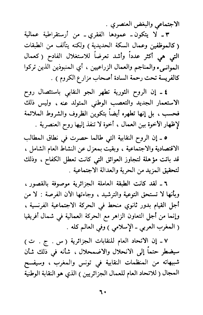 6 - لقد كانت الطبقة العاملة الجزائرية موصوفة بالقصور، وبأنها لا تستحق التوعية والترشيد، وجاءتها الآن الفرصة: لا من أجل القيام بدور ثانوي منحط في الحركة الاجتماعية الفرنسية، ,وإنما من أجل التعاون الزاهر مع الحركة العمالية في شمال أفريقيا (المغرب العربي - الإسلامي) وفي العالم كله.