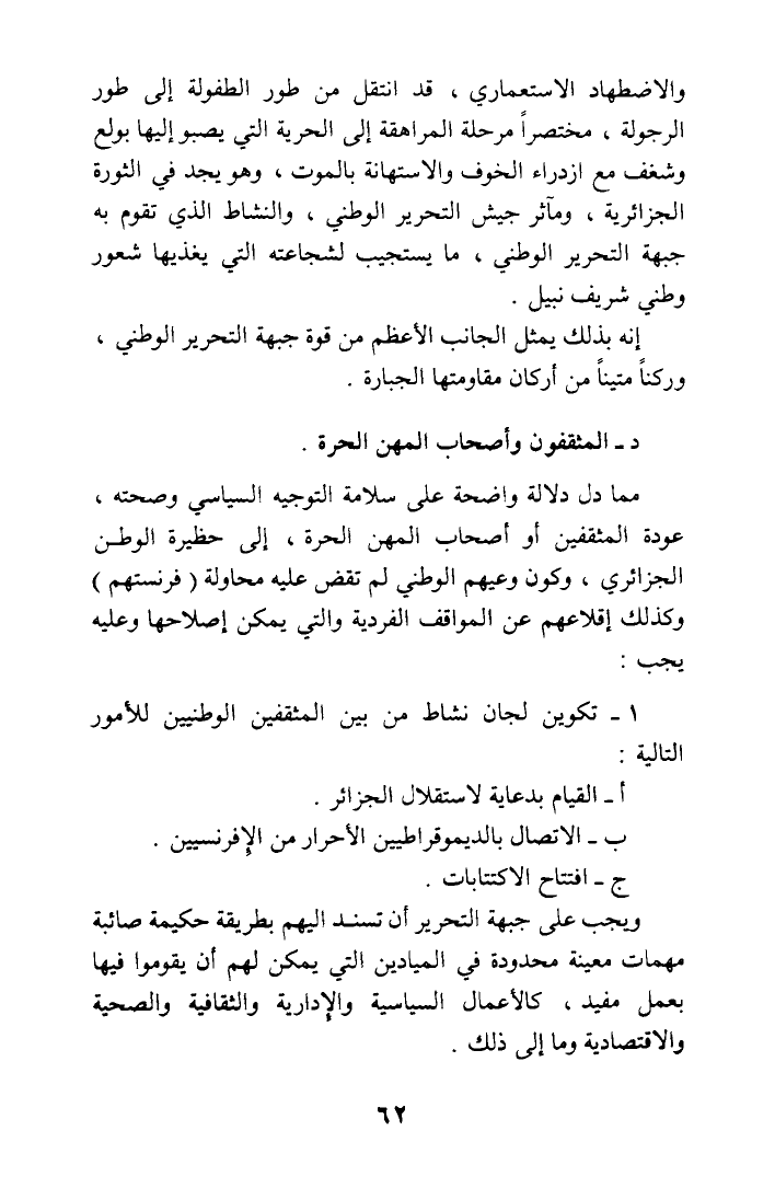 ويجب على جبهة التحرير أن تسند اليهم بطريقة حكيمة صائبة مهمات معينة محدودة في الميادين التي يمكن لهم أن يقوموا فيها بعمل مفيد، كالأعمال السياسية والإدارية والثقافية والصحية والاقتصادية وما إلى ذلك.