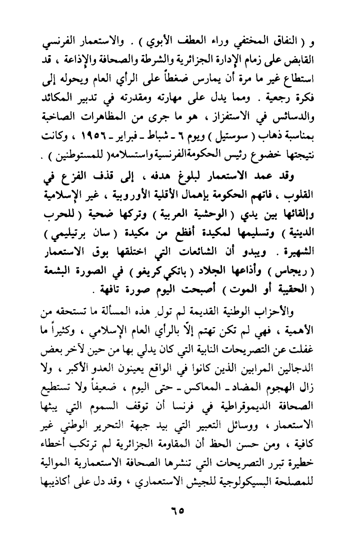 و (النفاق المختفي وراء العطف الأبوي). والاستعمار الفرنسي القابض على زمام الإدارة الجزائرية والشرطة والصحافة والإذاعة، قد استطاع غير ما مرة أن يمارس ضغطا على الرأي العام ويحوله الى فكرة رجعية. ومما يدل على مهارته ومقدرته في تدبير المكائد والدسائس في الاستفزاز، هو ما جرى من المظارات الصاخبة بمناسبة ذهاب (سوستيل) ويوم 6 - شباط - فبراير - 1956، وكانت نتيجتها خضوع رئيس الحكومة؛ لفرنسة واستسلامه (للمستوطنين).