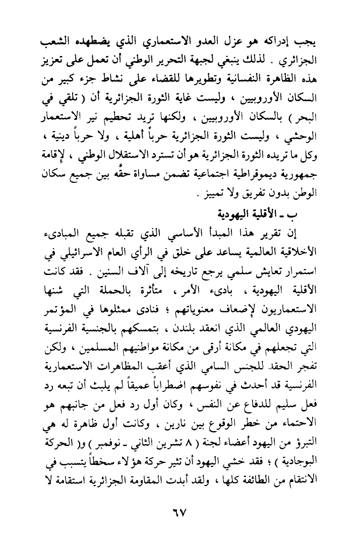 إن تقرير هذا المبدأ الأساسي الذي تقبله جميع المبادىء الأخلاقية العالمية يساعد على خلق في الرأي العام الاسرائيلي في استمرار تعايش سلمي يرجع تاريخه إلى آلاف السنين. فقد كانت الأقلية اليهودية، بادىء الأمر، متأثرة بالحملة التي شنها الاستعماريون لإضعاف معنوياتهم؛ فنادى ممثلوها في المؤتمر اليهودي العالمي الذي انعقد بلندن، بتمسكهم بالجنسية الفرنسية التي تجعلهم في مكانة أرقى من مكانة مواطنيهم المسلمين، ولكن تفجر الحقد للجنس السامي الذي أعقب المظاهرات الاستعمارية الفرنسية قد أحدث في نفوسهم اضطرابا عميقا لم يلبث أن تبعه رد فعل سليم للدفاع عن النفس، وكان أول رد فعل من جانبهم هو الاحتماء من خطر الوقوع بين نارين، وكانت أول ظاهرة له هي التبرؤ من اليهود أعضاء لجنة (8 تشرين الثاني - نوفمبر) و (الحركة البوجادية)؛ فقد خشي اليهود أن تثير حركة هؤلاء سخطا يتسبب في الانتقام من الطائفة كلها، ولقد أبدت المقاومة الجزائرية استقامة لا