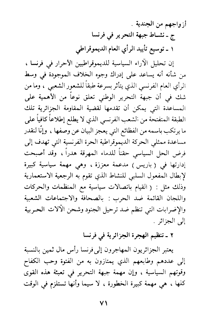 إن تحليل الآراء السياسية للديموقراطيين الأحرار في فرنسا، من شأنه أنه يساعد على إدراك وجوه الخلاف الموجودة في وسط الرأي العام الفرنسي الذي يتأثر بسرعة طبقا للشعور الشعبي، وما من شك في أن جبهة التحرير الوطني تعلق نوعا من الأهمية على المساعدة التي يمكن أن تقدمها لقضية المقاومة الجزائرية تلك الطبقة المتفتحة من الشعب الفرنسي الذي لا يطلع إطلاعا كافيا على ما يرتكب باسمه من الفظائع التي يعجز البيان عن وصفها، وإنا لنقدر مساعدة ممثلي الحركة الديموقراطية الحرة الفرنسية التي تهدف إلى فرض الحل السياسي حقنا للدماء المهرقة هدرا، وقد أصبحت إدارتها في (باريس) مدعمة معززة، وهي مهمة سياسية كبيرة لإطال المفعول السلبي للنشاط الذي تقوم به الرجعية الاستعمارية وذلك مثل: (القيام باتصالات سياسية مع المنظمات والحركات واللجان القائمة ضد الحرب: بالصحافة والاجتماعات الشعبية والاضرابات التي تنظم ضد ترحيل الجنود وشحن الآلات الحربية إلى الجزائر.