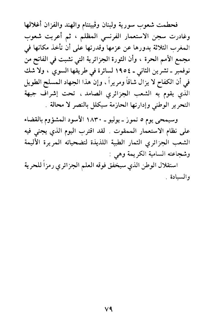 وسيمحى يوم 5 تموز - يوليو - 1830 الأسود المشؤوم بالقضاء على نظام الاستعمار الممقوت لقد اقترب اليوم الذي يجني فيه الشعب الجزائري الثمار الطيبة اللذيذة لتضحياته المريرة الأليمة وشجاعته السامية الكريمة وهي: