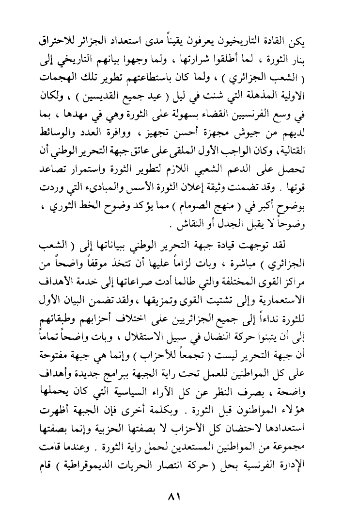 يكن القادة التاريخيون يعرفون يقينا مدى استعداد الجزائر للاحتراق بنار الثورة، لما أطلقوا شرارتها، ولما وجهوا بيانهم التاريخي إلى (الشعب الجزائري)، ولما كان باستطاعتهم تطوير تلك الهجمات الأولية المذهلة التي شنت في ليل (عيد جميع القديسين)، ولكان في وسع الفرنسيين القضاء بسهولة على الثورة وهي في مهدها، بما لديهم من جيوش مجهزة أحسن تجهيز، ووافرة العدد والوسائط القتالية، وكان الواجب الأول الملقى على عاتق جبهة التحرير الوطني أن تحصل على الدعم الشعبي اللازم لتطوير الثورة واستمرار تصاعد قوتها. وقد تضمنت وثيقة إعلان الثورة الأسس والمبادىء التي وردت بوضوح أكبر في (منهح الصومام) مما يؤكد وضوح الخط الثوري، وضوحا لا يقبل الجدل أو النقاش.