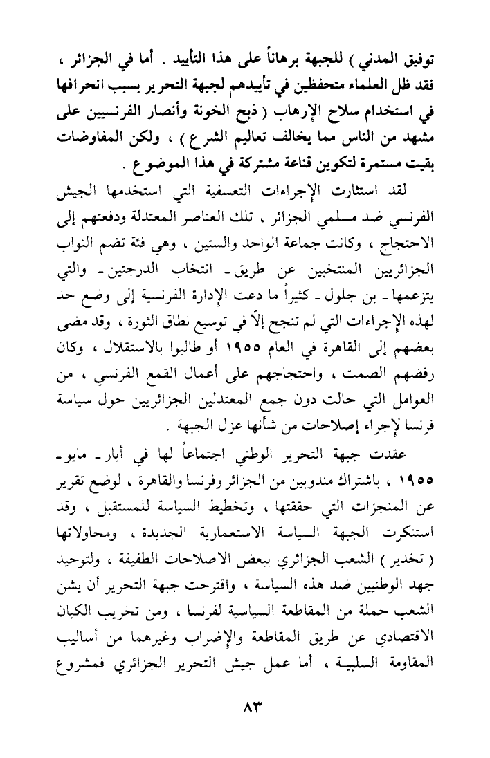 توفيق المدني) للجبهة برهانا على هذا التأييد. أما في الجزائر، فقد ظل العلماء متحفظين في تأييدهم لجبهة التحرير بسبب انحرافها في استخدام سلاح الإرهاب (ذبح الخونة وأنصار الفرنسيين على مشهد من الناس مما يخالف تعاليم الشرع)، ولكن المفاوضات بقيت مستمرة لتكوين قناعة مشتركة في هذا الموضوع.