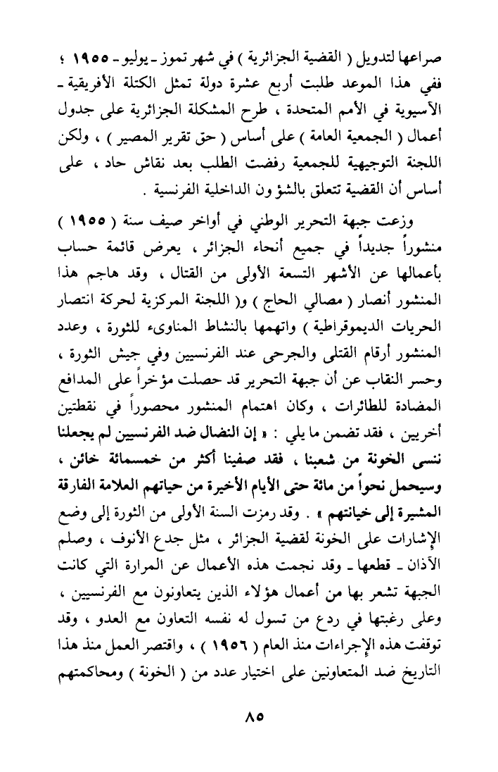 وزعت جبهة التحرير الوطنى في أواخر صيف سنة (1955) منشورا جديدا في جميع أنحاء الجزائر، يعرض قائمة حساب بأعمالها عن الأشهر التسعة الأولى من القتال، وقد هاجم هذا المنشور أنصار (مصالي الحاج) و (اللجنة المركزية لحركة انتصار الحريات الديموقراطية) واتهمها بالنشاط المناوىء للثورة، وعدد المنشور أرقام القتلى والجرحى عند الفرنسيين وفي جيش الثورة، وحسر النقاب عن أن جبهة التحرير قد حصلت مؤخرا على المدافع المضادة للطائرات، وكان اهتمام المنشور محصورا في نقطتين أخريين، فقد تضمن ما يلي: (إن النضال ضد الفرنسيين لم يجعلنا ننسى الخونة من شعبنا، فقد صفينا أكثر من خمسمائة خائن، وسيحمل نحوا من مائة حتى الأيام الأخيرة من حياتهم العلامة الفارقة المشيرة إلى خيانتهم). وقد رمزت السنة الأولى من الثورة إلى وضع الإدارات على الخونة لقضية الجزائر، مثل جدع الأنوف، وصلم الآذان - قطعها - وقد نجمت هذه الأعمال عن المرارة التي كانت الجبهة تشعر بها من أعمال هؤلاء الذين يتعاونون مع الفرنسيين، وعلى رغبتها في ردع من تسول له نفسه التعاون مع العدو، وقد توقفت هذه الإجراءات منذ العام (1956)، واقتصر العمل منذ هذا التاريخ ضد المتعاونين على اختيار عدد من (الخونة) ومحاكمتهم