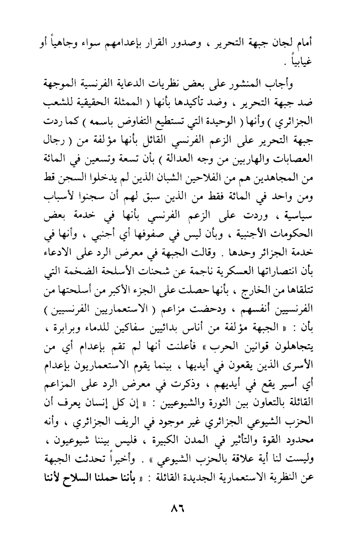 وأجاب المنشور على بعض نظريات الدعاية الفرنسية الموجهة ضد جبهة التحرير، وضد تأكيدها بأنها (الممثلة الحقيقية للشعب الجزائري) وأنها (الوحيدة التي تستطيع التفاوض باسمه) كما ردت جبهة التحرير على الزعم الفرنسي القائل بأنها مؤلفة من (رجال العصابات والهاربين من وجه العدالة) بأن تسعة وتسعين في المائة من المجاهدين هم من الفلاحين الشبان الذين لم يدخلوا السجن قط ومن واحد في المائة فقط من الذين سبق لهم أن سجنوا لأسباب سياسية، وردت على الزعم الفرنسي بأنها في خدمة بعض الحكومات الأجنبية، وبأن ليس في صفوفها أي أجنبي، وأنها في خدمة الجزائر وحدهما. وقالت الجبهة في معرض الرد على الادعاء بأن انتصاراتها العسكرية ناجمة عن شحنات الأسلحة الضخمة التي تتلقاها من الخارج، بأنها حصلت على الجزء الأكبر من أسلحتها من الفرنسيين أنفسهم، ودحضت مزاعم (الاستعماريين الفرنسيين) بأن: (الجبهة مؤلفة من أناس بدائيين سفاكين للدماء وبرابرة، يتجاهلون قوانين الحرب) فأعلنت أنها لم تقم بإعدام أي من الأسرى الذين يقعون في أيديها، بينما يقوم الاستعماريون بإعدام أي أسير يقع في أيديهم، وذكرت في معرض الرد على المزاعم القائلة بالتعاون بين الثورة والشيوعيين: (إن كل إنسان يعرف أن الحزب الشيوعي الجزائري غير موجود في الريف الجزائري، وأنه محدود القوة والتأثير في المدن الكبيرة، فليس بيننا شيوعيون، وليست لنا أية علاقة بالحزب الشيوعي). وأخيرا تحدثت الجبهة عن النظرية الاستعمارية الجديدة القائلة: (بأننا حملنا السلاح لأننا
