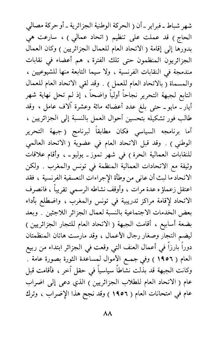 شهر شباط - فبراير - أن (الحركة الوطنية الجزائرية - أو حركة مصالي الحاج) قد عملت على تنظيم (اتحاد عمالي)، سارعت هي بدورها إلى إقامة (الاتحاد العام للعمال الجزائريين) وكان العمال الجزائريون المنظمون حتى تلك الفترة، هم أعضاء في نقابات مندمجة في النقابات الفرنسية، ولا سيما التابعة منها للشيوعيين، والمسماة (بالاتحاد العام للعمل). وقد لقي الاتحاد العام للعمال التابع لجبهة التحرير نجاحا أوليا واضحا، إذ لم تحل نهاية شهر أيار - مايو - حتى بلغ عدد أعضائه مائة وعشرة آلاف عامل، وقد طالب فور تشكيله بتحسين أحوال العمل بالنسبة إلى الجزائريين، أما برنامجه السياسي فكان مطابقا لبرنامج (جبهة التحرير الوطني). وقد قبل الاتحاد العام في عضوية (الاتحاد العالمي للنقابات العمالية الحرة) في شهر تموز - يوليو -، وأقام علاقات وثيقة مع الاتحادات العمالية المنظمة في تونس والمغرب. ولكن الاتحاد ما لبث أن عانى من وطأة الإجراءات التعسفية الفرنسية، فقد اعتقل زعماؤه عدة مرات، وأوقف نشاطه الرسمي تقريبا، فانصرف الاتحاد لإقامة مراكز تدريبية في تونس والمغرب، واضطلع بأداء بعض الخدمات الاجتماعية بالنسبة لعمال الجزائر اللاجئين. وبعد بضعة أسابيع، أقامت الجبهة (الاتحاد العام للتجار الجزائريين) ليضم التجار وصغار رجال الأعمال، وقد مارست هاتان المنظمتان دورا بارزا في أعمال العنف التي وقعت في الجزائر ابتداء من ربيع العام (1956) وفي جمع الأموال لمساعدة الثورة بصورة عامة. وكانت الجبهة قد بذلت نشاطا سياسيا في حقل آخر، فأقامت قبل عام (الاتحاد العام للطلاب الجزائريين) الذي دعى إلى اضراب عام في امتحانات العام (1956) وقد نجح هذا الاضراب، وترك