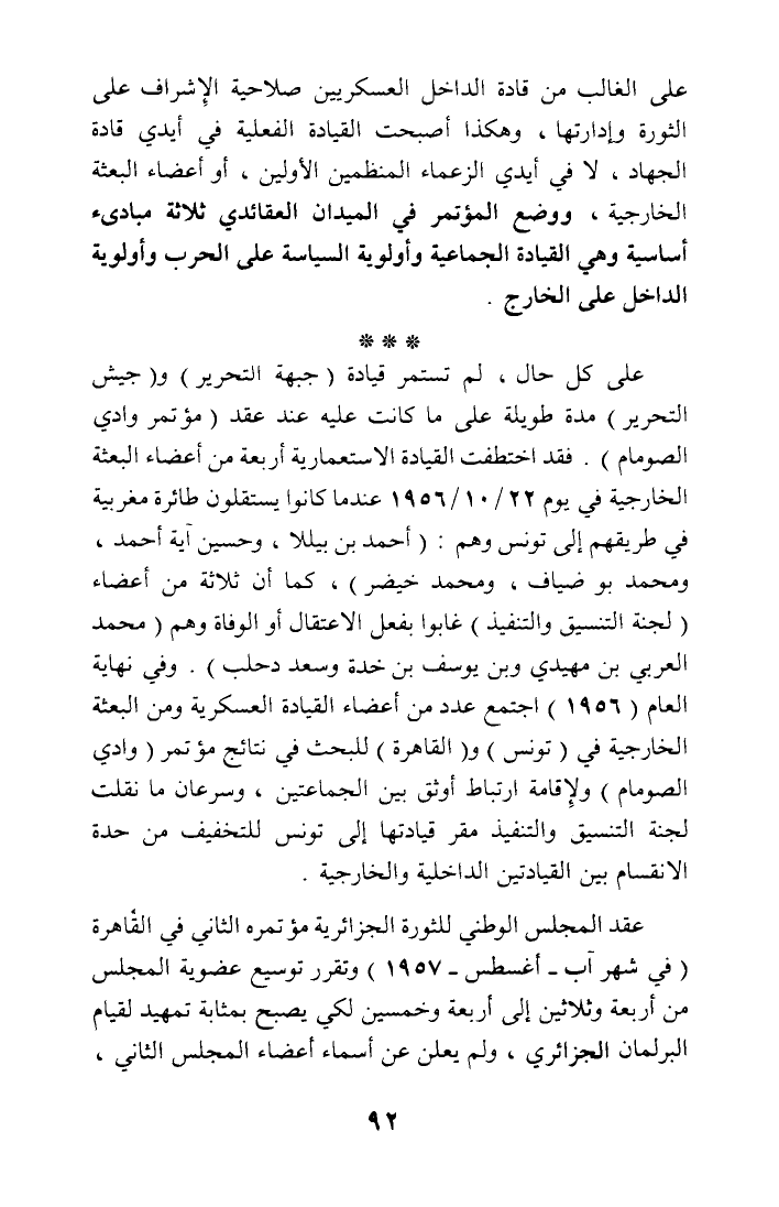 على كل حال، لم تستمر قيادة (جبهة التحرير) و (جيش التحرير) مدة طويلة على ما كانت عليه عند عقد (مؤتمر وادي الصومام). فقد اختطفت القيادة الاستعمارية أربعة من أعضاء البعثة الخارجية في يوم 22/ 10/ 1956 عندما كانوا يستقلون طائرة مغربية في طريقهم إلى تونس وهم: (أحمد بن بيللا، وحسين آية أحمد، ومحمد بو ضياف، ومحمد خيضر)، كما أن ثلاثة من أعضاء (لجنة التنسيق والتنفيذ) غابوا بفعل الاعتقال أو الوفاة وهم (محمد العربي بن مهيدي وبن يوسف بن خدة وسعد دحلب). وفي نهاية العام (1956) اجتمع عدد من أعضاء القيادة العسكرية ومن البعثة الخارجية في (تونس) و (القاهرة) للبحث في نتائح مؤتمر (وادي الصومام) ولإقامة ارتباط أوثق بين الجماعتين، وسرعان ما نقلت لجنة التنسيق والتنفيذ مقر قيادتها إلى تونس للتخفيف من حدة الانقام بين القيادتين الداخلية والخارجية.