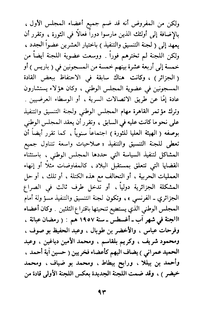 ولكن من المفروض أنه قد ضم جميع أعضاء المجلس الأول، بالإضافة إلى أولئك الذين مارسوا دورا فعالا في الثورة، وتقرر أن يعهد إلى (لجنة التنسيق والتنفيذ) باختيار العشرين عضوا الجدد، ولكن اللجنة لم تخترهم فورا. ووسعت عضوية اللجنة أيضا من خمسة إلى أربعة عشرة بينهم خمسة من المسجونين في (باريس) أو (الجزائر)، وكانت هناك سابقة في الاحتفاظ ببعض القادة المسجونين في عضوية المجلس الوطني، وكان هؤلاء يستشارون عادة إما عن طريق الاتصالات السرية، أو الوسطاء العرضيين. وترك مؤتمر القاهرة مهام المجلس الوطني ولجنة التنسيق والتنفيذ على نحو ما كانت عليه في السابق، وتقرر أن يعقد المجلس الوطني بوصفه (الهيئة العليا للثورة) اجتماعا سنويا، كما تقرر أيضا أن تعطى للجنة التنسيق والتنفيذ (صلاحيات واسعة تتناول جميع المشاكل لتنفيذ السياسة التي حددها المجلس الوطني، باستثناء القضايا التي تتعلق بمستقبل البلاد، كالمفاوضات مثلا أو إنهاء العمليات الحربية، أو التحالف مع هذه الكتلة، أو تلك، أو حل المشكلة الجزائرية دوليا، أو تدخل طرف ثالث في الصراع الجزائري - الفرنسي)، وتكون لجنة التنسيق والتنفيذ مسؤولة أمام المجلس الوطني الذي يستطيع تنحيتها باقتراع الثلثين. وكان أعضاء اللجنة في شهر آب - أغطس - سنة 1957 هم: (رمضان عبانة، وفرحات عباس، والأخضر بن طوبال، وعبد الحفيظ بوصوف، ومحمود شريف، وكريم بلقاسم، ومحمد الأمين دباغين، وعبد الحميد عمراني) يضاف اليهم كأعضاء فخريين (حسين آية أحمد، وأحمد بن يللا، ورابح بيطاط، ومحمد بو ضياف، ومحمد خيضر)، وقد ضمت اللجة الجديدة بعكس اللجنة الأولى قادة من