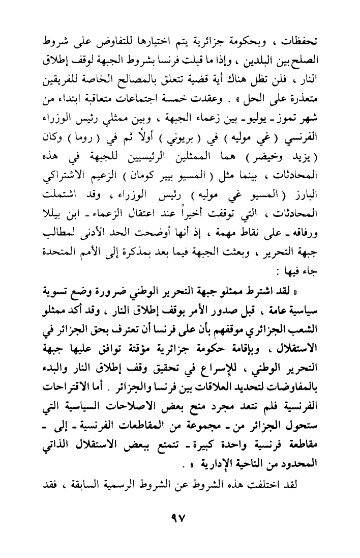تحفظات، وبحكومة جزائرية يتم اختيارها للتفاوض على شروط الصلح بين البلدين، وإذا ما قبلت فرنسا بشروط الجبهة لوقف إطلاق النار، فلن تظل هناك أية قضية تتعلق بالمصالح الخاصة للفريقين متعذرة على الحل). وعقدت خمسة اجتماعات متعاقبة ابتداء من شهر تموز - يوليو - بين زعماء الجبهة، وبين ممثلي رئيس الوزراء الفرنسي (غي موليه) في (بريوني) أولا ثم في (روما) وكان (يزيد وخيضر) هما الممثلين الرئيسيين للجبهة في هذه المحادثات، بينما مثل (المسيو بيير كومان) الزعيم الاشتراكي البارز (المسيو غي موليه) رئيس الوزراء، وقد اشتملت المحادثات، التي توقفت أخيرا عند اعتقال الزعماء - ابن بيللا ورفاقه - على نقاط مهمة، إذ أنها أوضحت الحد الأدنى لمطالب جبهة التحرير، وبعثت الجبهة فيما بعد بمذكرة إلى الأمم المتحدة جاء فيها: