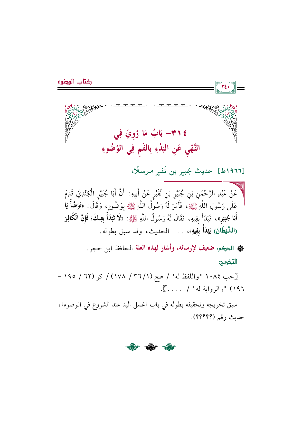 ◼ عَنْ عَبْدِ الرَّحْمَنِ بْنِ جُبَيْرِ بْنِ نُفَيْرٍ عَنْ أَبِيهِ: أَنَّ أَبَا جُبَيْرٍ الْكِنْدِيَّ قَدِمَ عَلَى رَسُولِ اللَّهِ صَلَّى اللهُ عَلَيْهِ وَسَلَّمَ، فَأَمَرَ لَهُ رَسُولُ اللَّهِ صَلَّى اللهُ عَلَيْهِ وَسَلَّمَ بِوَضُوءٍ، وَقَالَ: ((تَوَضَّأْ يَا أَبَا جُبَيْرٍ))، فَبَدَأَ بِفِيهِ، فَقَالَ لَهُ رَسُولُ اللَّهِ صَلَّى اللهُ عَلَيْهِ وَسَلَّمَ: ((لَا تَبْدَأْ بِفِيكَ؛ فَإِنَّ الْكَافِرَ (الشَّيْطَانَ) يَبْدَأُ بِفِيهِ))، ... الحديث، وقد سبق بطوله.