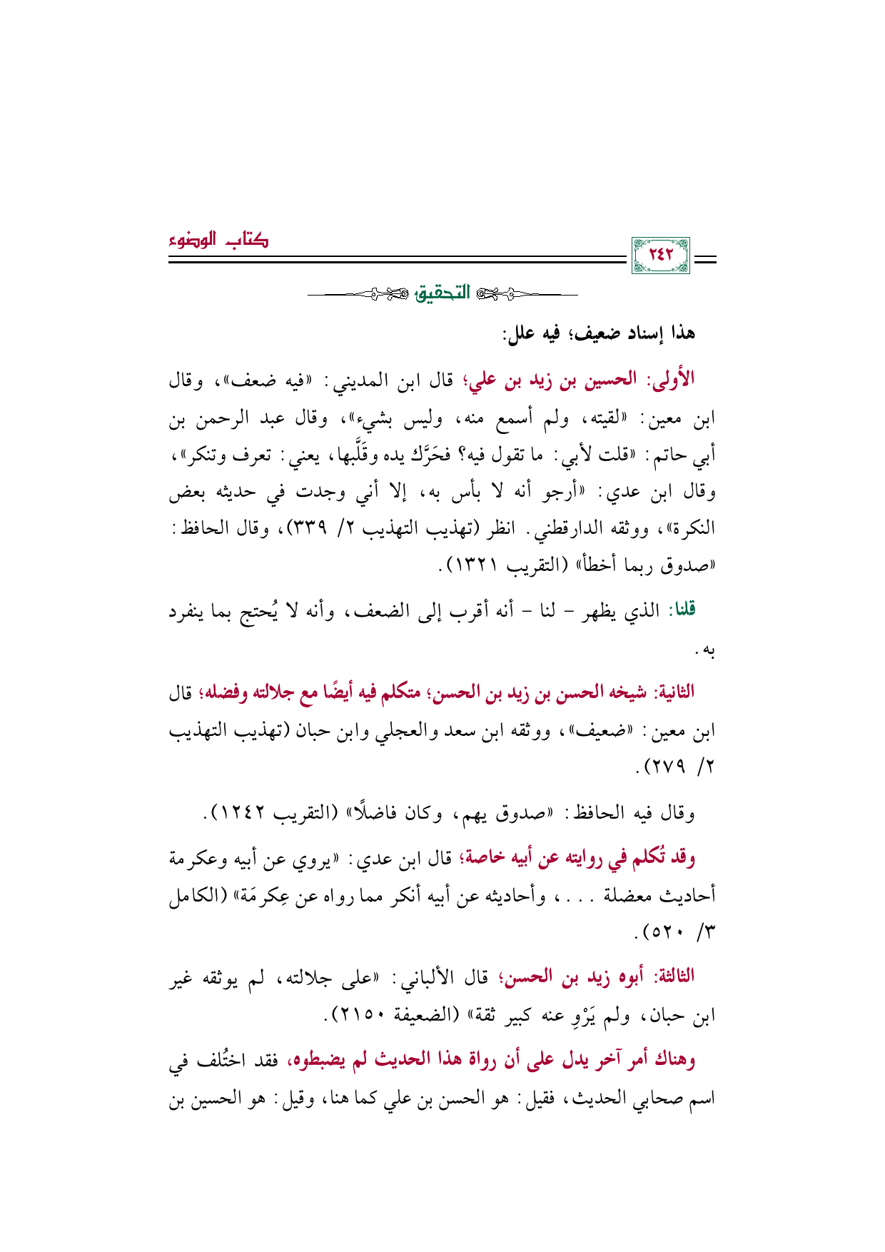 الثانية: شيخه الحسن بن زيد بن الحسن؛ متكلم فيه أيضًا مع جلالته وفضله؛ قال ابن معين: "ضعيف"، ووثقه ابن سعد والعجلي وابن حبان (تهذيب التهذيب ٢/ ٢٧٩).