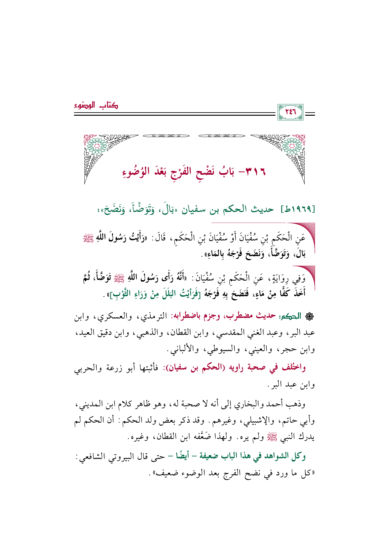 وكل الشواهد في هذا الباب ضعيفة - أيضًا - حتى قال البيروتي الشافعي: "كل ما ورد في نضح الفرج بعد الوضوء ضعيف".