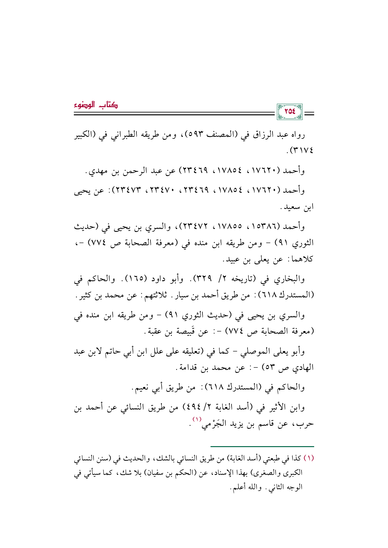وابن الأثير في (أسد الغابة ٢/ ٤٩٤) من طريق النسائي عن أحمد بن حرب، عن قاسم بن يزيد الجَرْمي (¬١).