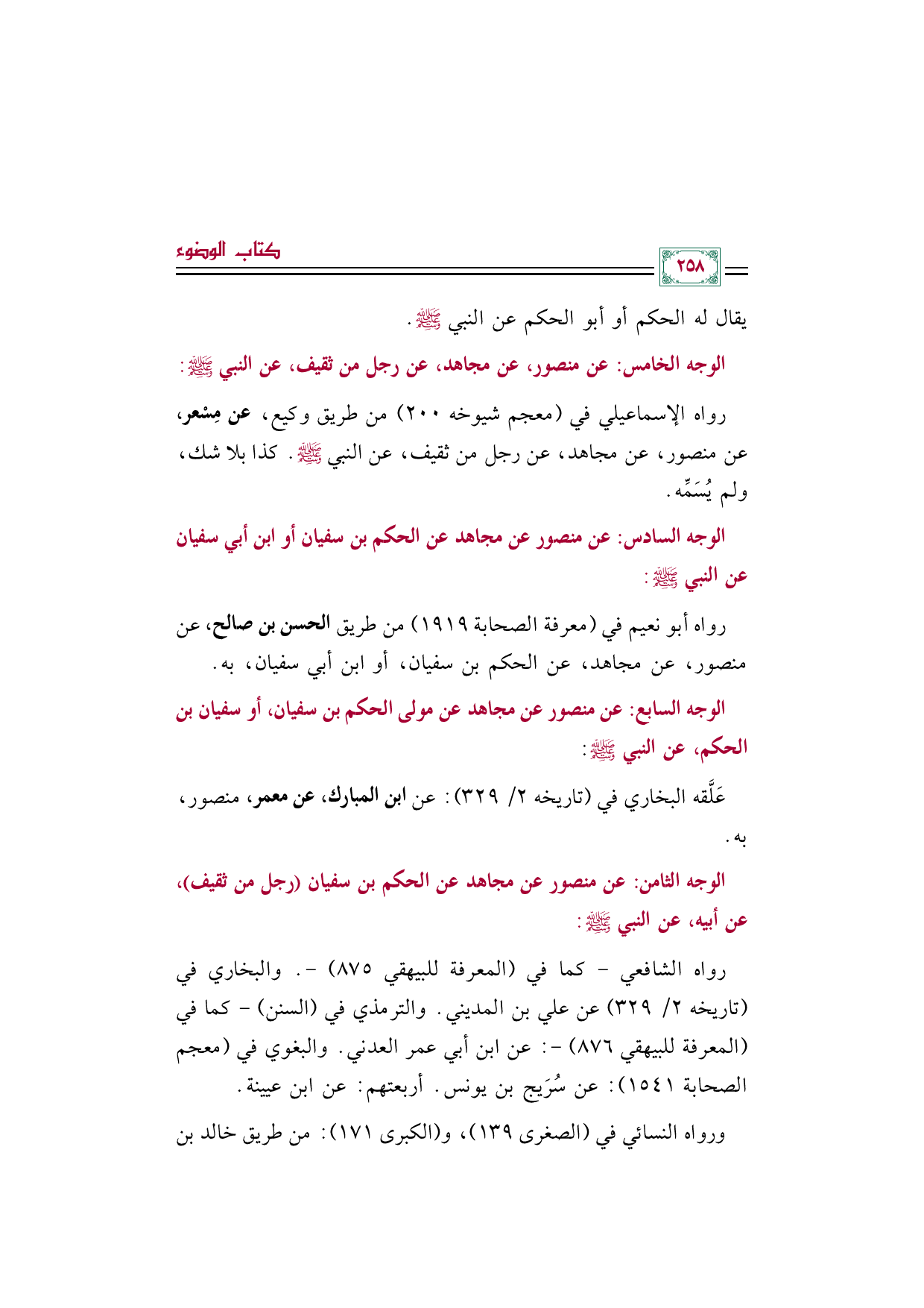 الوجه السابع: عن منصور عن مجاهد عن مولى الحكم بن سفيان، أو سفيان بن الحكم، عن النبي صَلَّى اللهُ عَلَيْهِ وَسَلَّمَ:
