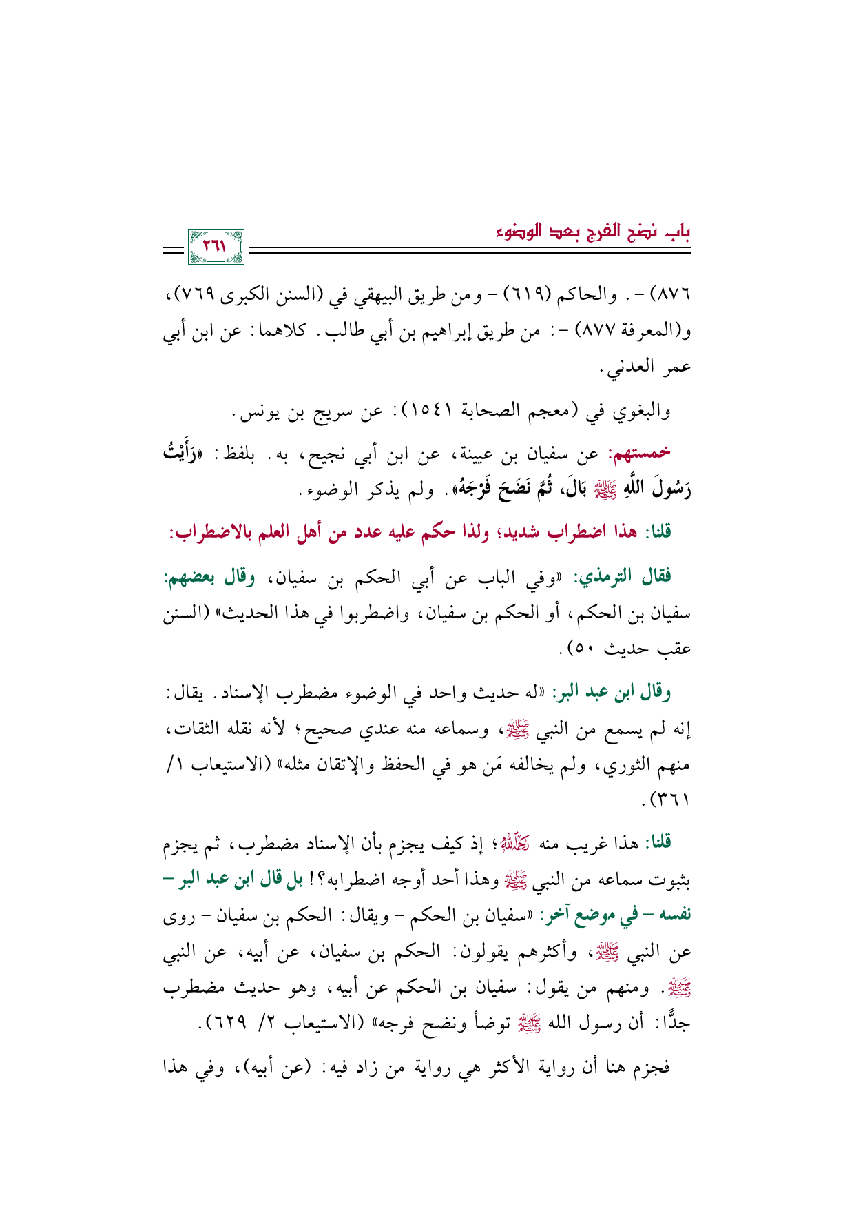 قلنا: هذا غريب منه رحمه الله؛ إذ كيف يجزم بأن الإسناد مضطرب، ثم يجزم بثبوت سماعه من النبي صلى الله عليه وسلم وهذا أحد أوجه اضطرابه؟ ! بل قال ابن عبد البر - نفسه - في موضع آخر: "سفيان بن الحكم - ويقال: الحكم بن سفيان - روى عن النبي صلى الله عليه وسلم، وأكثرهم يقولون: الحكم بن سفيان، عن أبيه، عن النبي صلى الله عليه وسلم. ومنهم من يقول: سفيان بن الحكم عن أبيه، وهو حديث مضطرب جدًّا: أن رسول الله صلى الله عليه وسلم توضأ ونضح فرجه" (الاستيعاب ٢/ ٦٢٩).