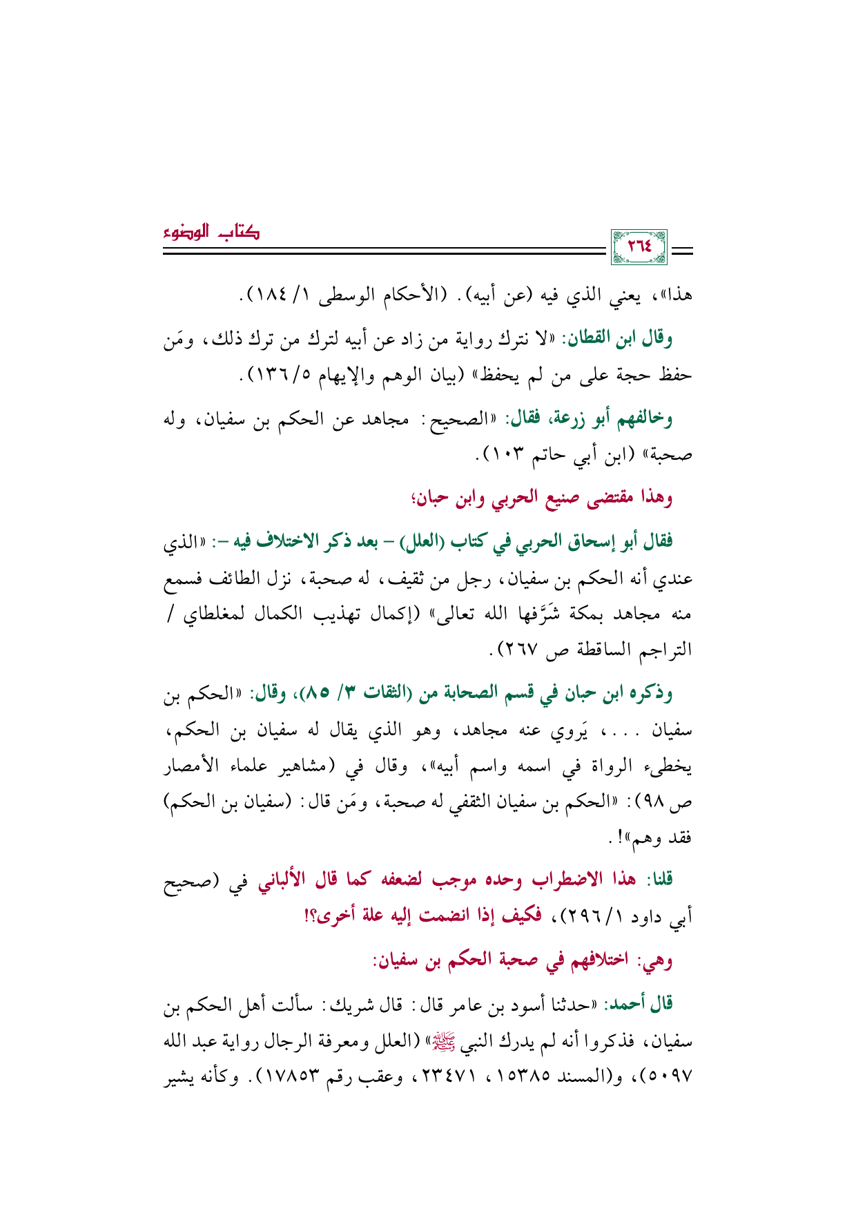 فقال أبو إسحاق الحربي في كتاب "العلل" - بعد ذكر الاختلاف فيه -: "الذي عندي أنه الحكم بن سفيان، رجل من ثقيف، له صحبة، نزل الطائف فسمع منه مجاهد بمكة شَرَّفها الله تعالى" (إكمال تهذيب الكمال لمغلطاي/ التراجم الساقطة ص ٢٦٧).