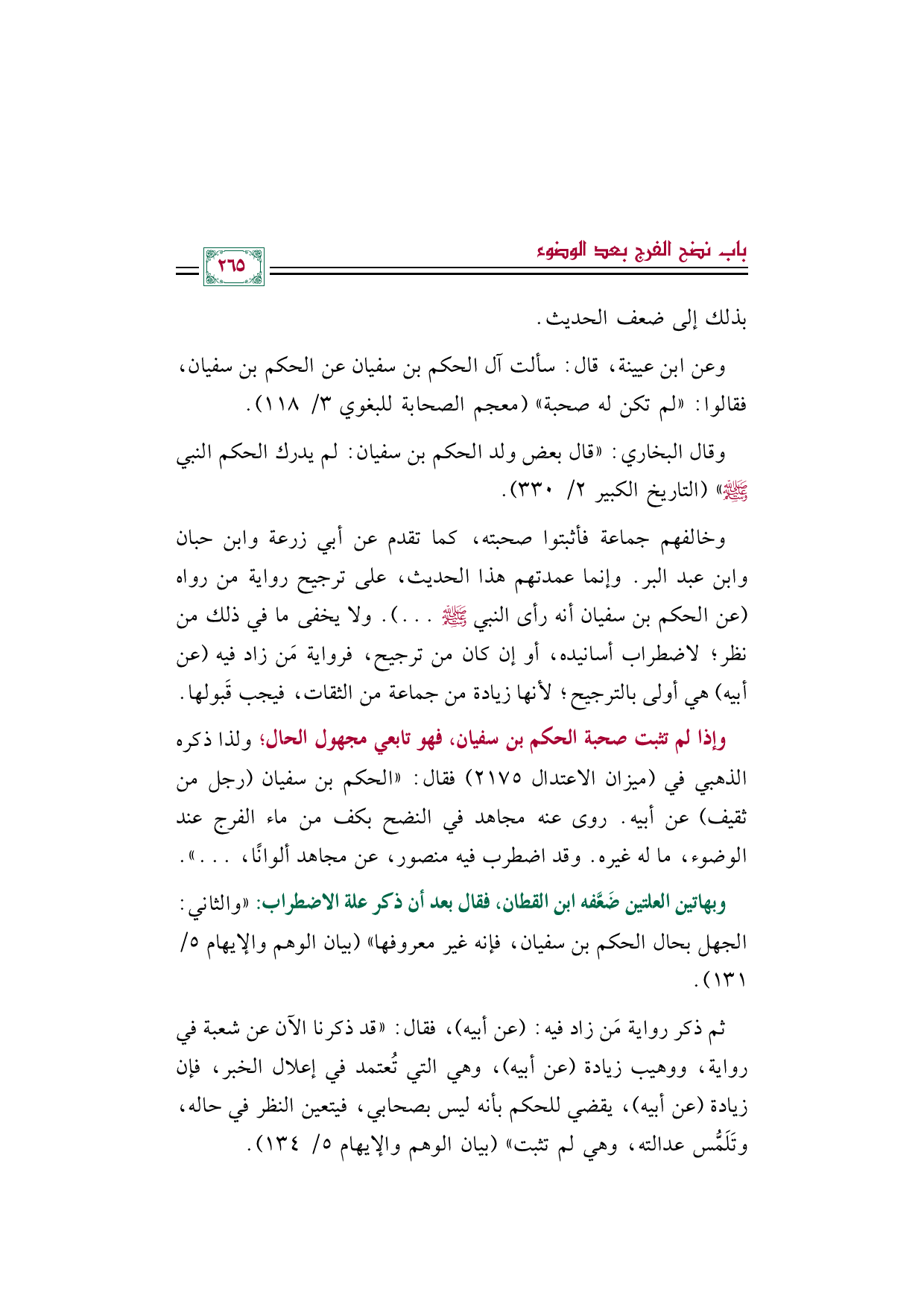 وبهاتين العلتين ضَعَّفه ابن القطان، فقال بعد أن ذكر علة الاضطراب: "والثاني: الجهل بحال الحكم بن سفيان، فإنه غير معروفها" (بيان الوهم والإيهام ٥/ ١٣١).