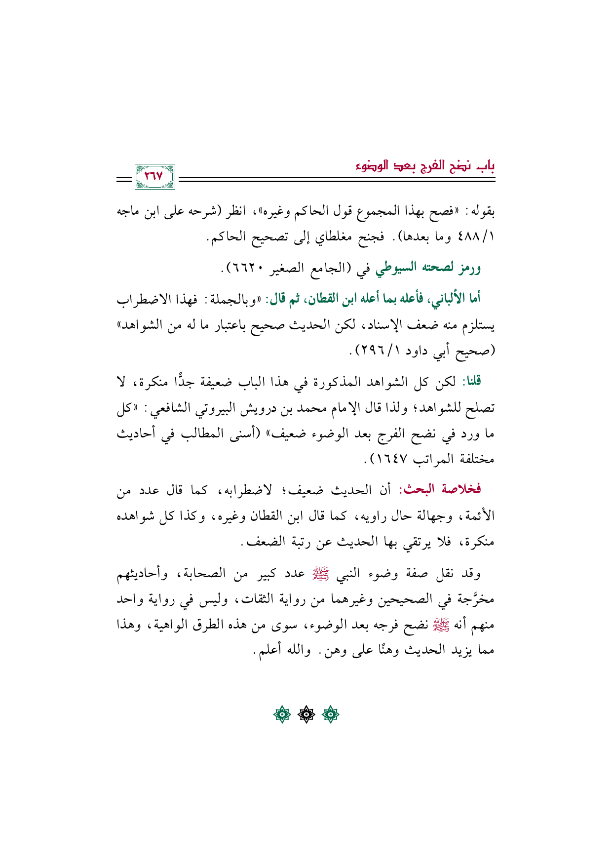 قلنا: لكن كل الشواهد المذكورة في هذا الباب ضعيفة جدًّا منكرة، لا تصلح للشواهد؛ ولذا قال الإمام محمد بن درويش البيروتي الشافعي: "كل ما ورد في نضح الفرج بعد الوضوء ضعيف" (أسنى المطالب في أحاديث مختلفة المراتب ١٦٤٧).