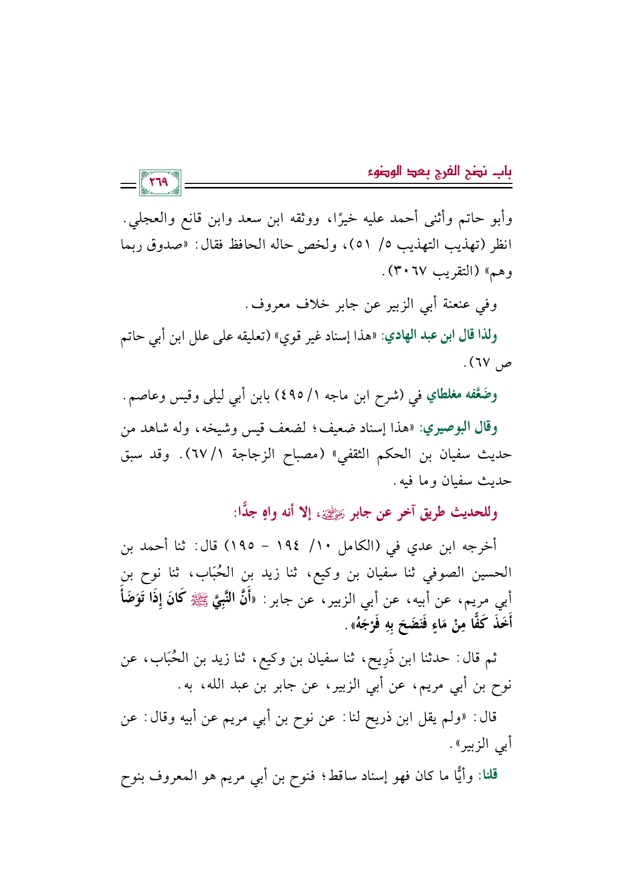 أخرجه ابن عدي في (الكامل ١٠/ ١٩٤ - ١٩٥) قال: ثنا أحمد بن الحسين الصوفي ثنا سفيان بن وكيع، ثنا زيد بن الحُبَاب، ثنا نوح بن أبي مريم، عن أبيه، عن أبي الزبير، عن جابر: ((أَنَّ النَّبِيَّ صَلَّى اللهُ عَلَيْهِ وَسَلَّمَ كَانَ إِذَا تَوَضَأَ أَخَذَ كَفًّا مِنْ مَاءٍ فَنَضَحَ بِهِ فَرْجَهُ)).