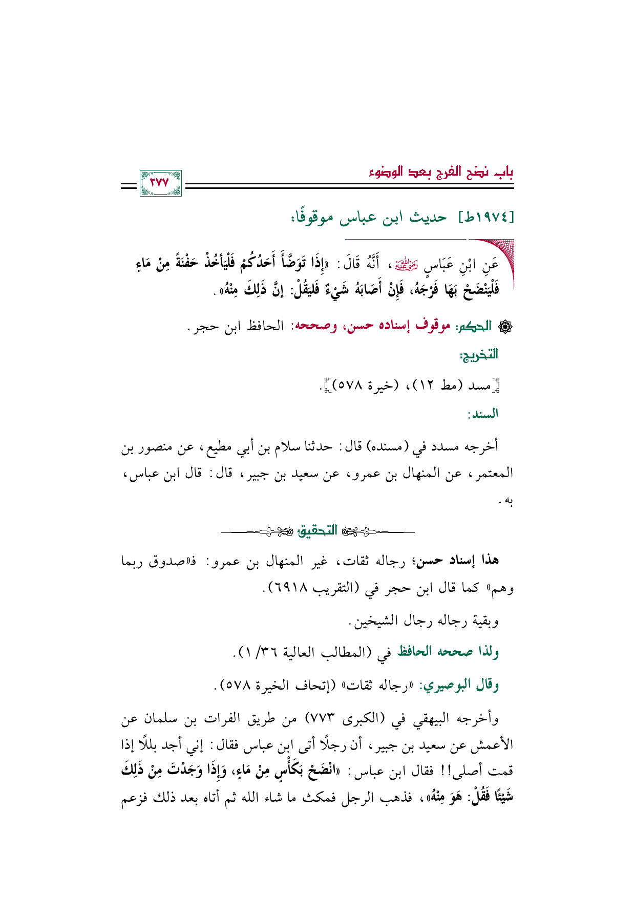 ◼ عَنِ ابْنِ عَبَاسٍ رضي الله عنه، أَنَّهُ قَالَ: ((إِذَا تَوَضَّأَ أَحَدُكُمْ فَلْيَأخُذْ حَفْنَةً مِنْ مَاءٍ فَلْيَنْضَحْ بَهَا فَرْجَهُ، فَإِنْ أَصَابَهُ شَيْءٌ فَليَقُلْ: إنَّ ذَلِكَ مِنْهُ)).