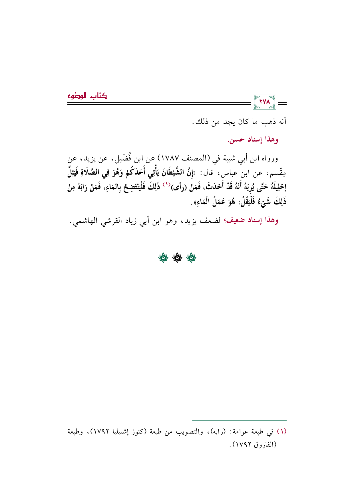 ورواه ابن أبي شيبة في (المصنف ١٧٨٧) عن ابن فُضَيل، عن يزيد، عن مِقْسم، عن ابن عباس، قال: ((إِنَّ الشَّيْطَانَ يَأْتِي أَحَدَكُمْ وَهُوَ فِي الصَّلَاةِ فَيَبُلَّ إحْلِيلَهُ حَتَّى يُرِيَهُ أَنَهُ قَدْ أَحْدَثَ، فَمَنْ (رأى) (¬١) ذَلِكَ فَلْيَنْتَضِحْ بِالمَاءِ، فَمَنْ رَابَهُ مِنْ ذَلِكَ شَيْءُ فَلْيَقُلْ: هُوَ عَمَلُ الْمَاءِ)).