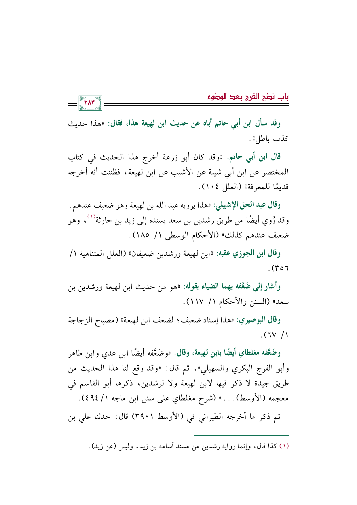 وقال عبد الحق الإشبيلي: "هذا يرويه عبد الله بن لهيعة وهو ضعيف عندهم. وقد رُوي أيضًا من طريق رشدين بن سعد يسنده إلى زيد بن حارثة (¬١)، وهو ضعيف عندهم كذلك" (الأحكام الوسطى ١/ ١٨٥).