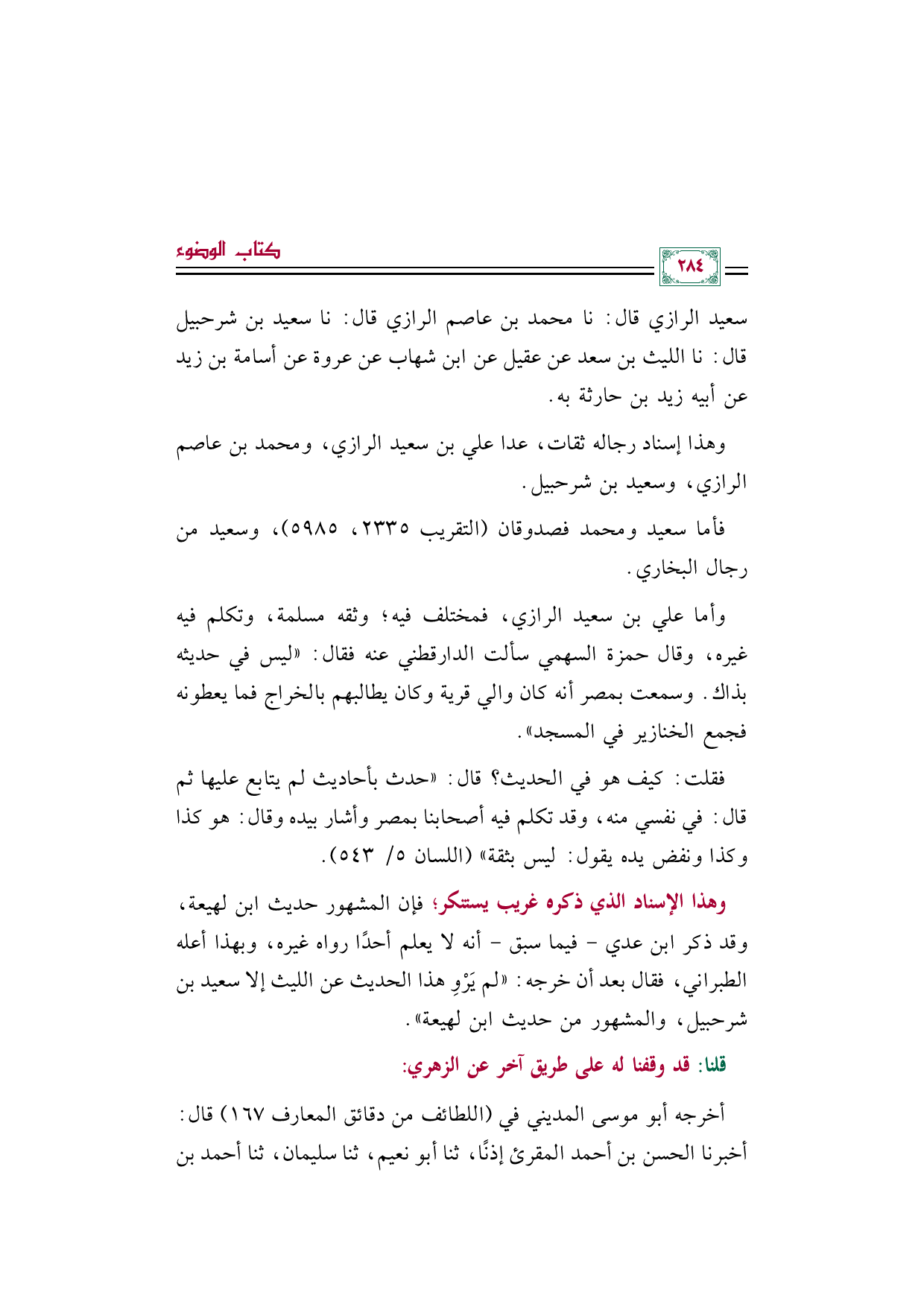 وهذا الإسناد الذي ذكره غريب يستنكر؛ فإن المشهور حديث ابن لهيعة، وقد ذكر ابن عدي - فيما سبق - أنه لا يعلم أحدًا رواه غيره، وبهذا أعله الطبراني، فقال بعد أن خرجه: "لم يَرْوِ هذا الحديث عن الليث إلا سعيد بن شرحبيل، والمشهور من حديث ابن لهيعة".
