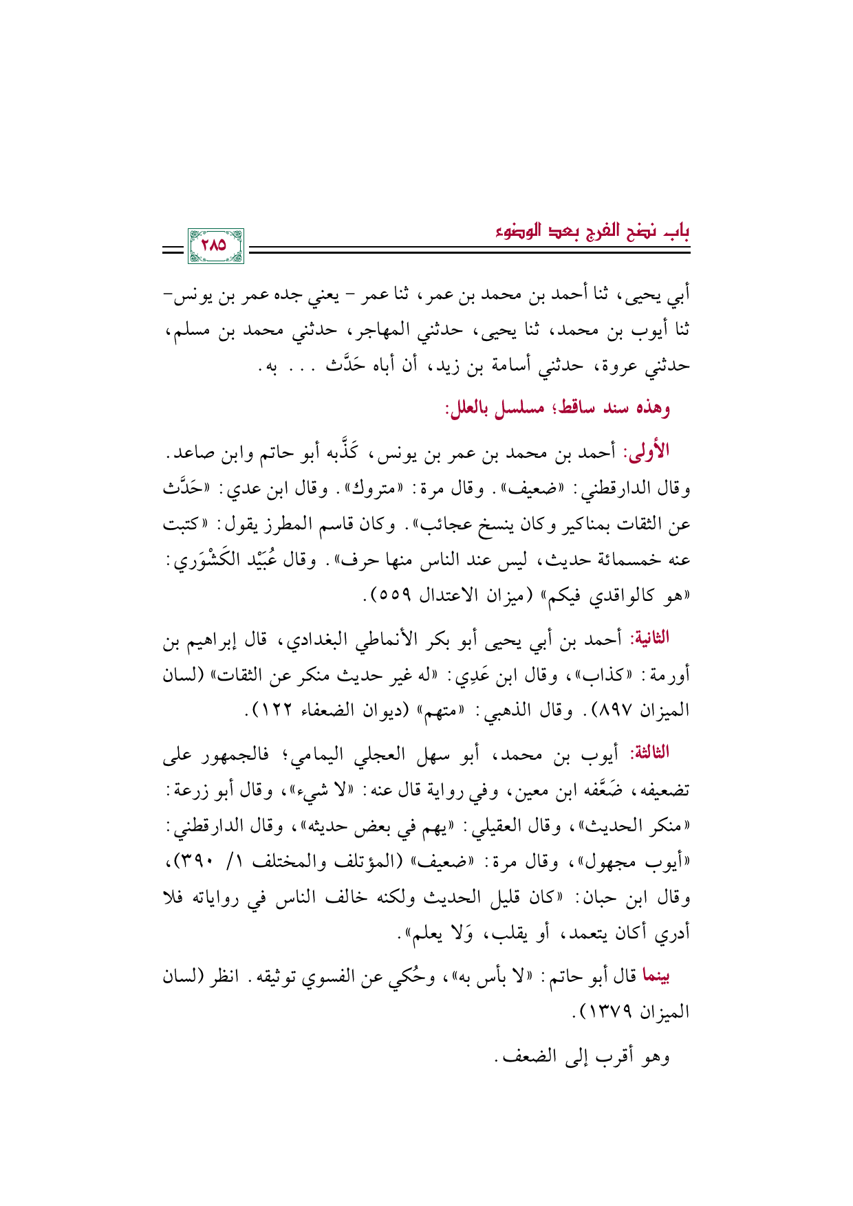 الثالثة: أيوب بن محمد، أبو سهل العجلي اليمامي؛ فالجمهور على تضعيفه، ضَعَّفه ابن معين، وفي رواية قال عنه: "لا شيء"، وقال أبو زرعة: "منكر الحديث"، وقال العقيلي: "يهم في بعض حديثه"، وقال الدارقطني: "أيوب مجهول"، وقال مرة: "ضعيف" (المؤتلف والمختلف ١/ ٣٩٠)، وقال ابن حبان: "كان قليل الحديث ولكنه خالف الناس في رواياته فلا أدري أكان يتعمد، أو يقلب، وَلا يعلم".