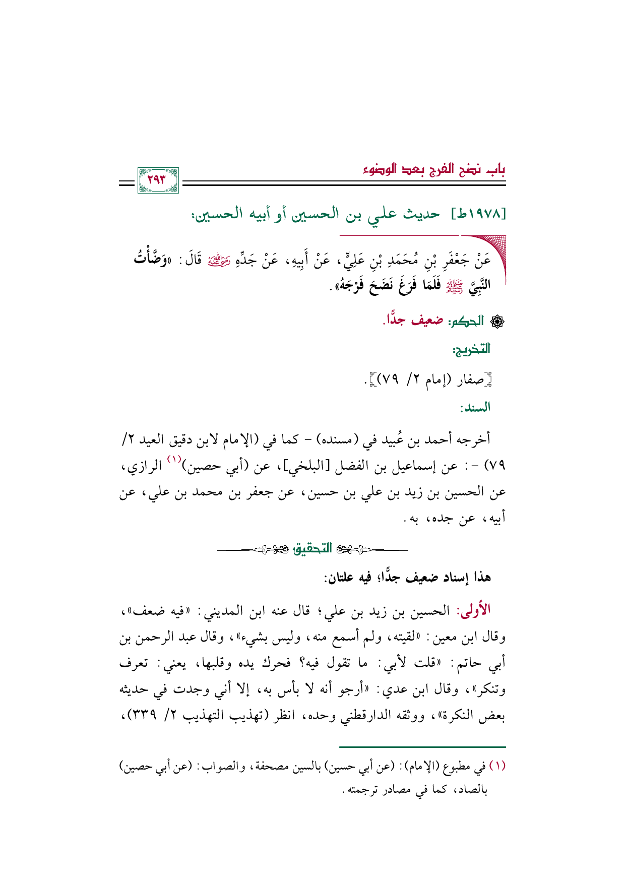 أخرجه أحمد بن عُبيد في (مسنده) - كما في (الإمام لابن دقيق العيد ٢/ ٧٩) -: عن إسماعيل بن الفضل [البلخي]، عن (أبي حصين) (¬١) الرازي، عن الحسين بن زيد بن علي بن حسين، عن جعفر بن محمد بن علي، عن أبيه، عن جده، به.