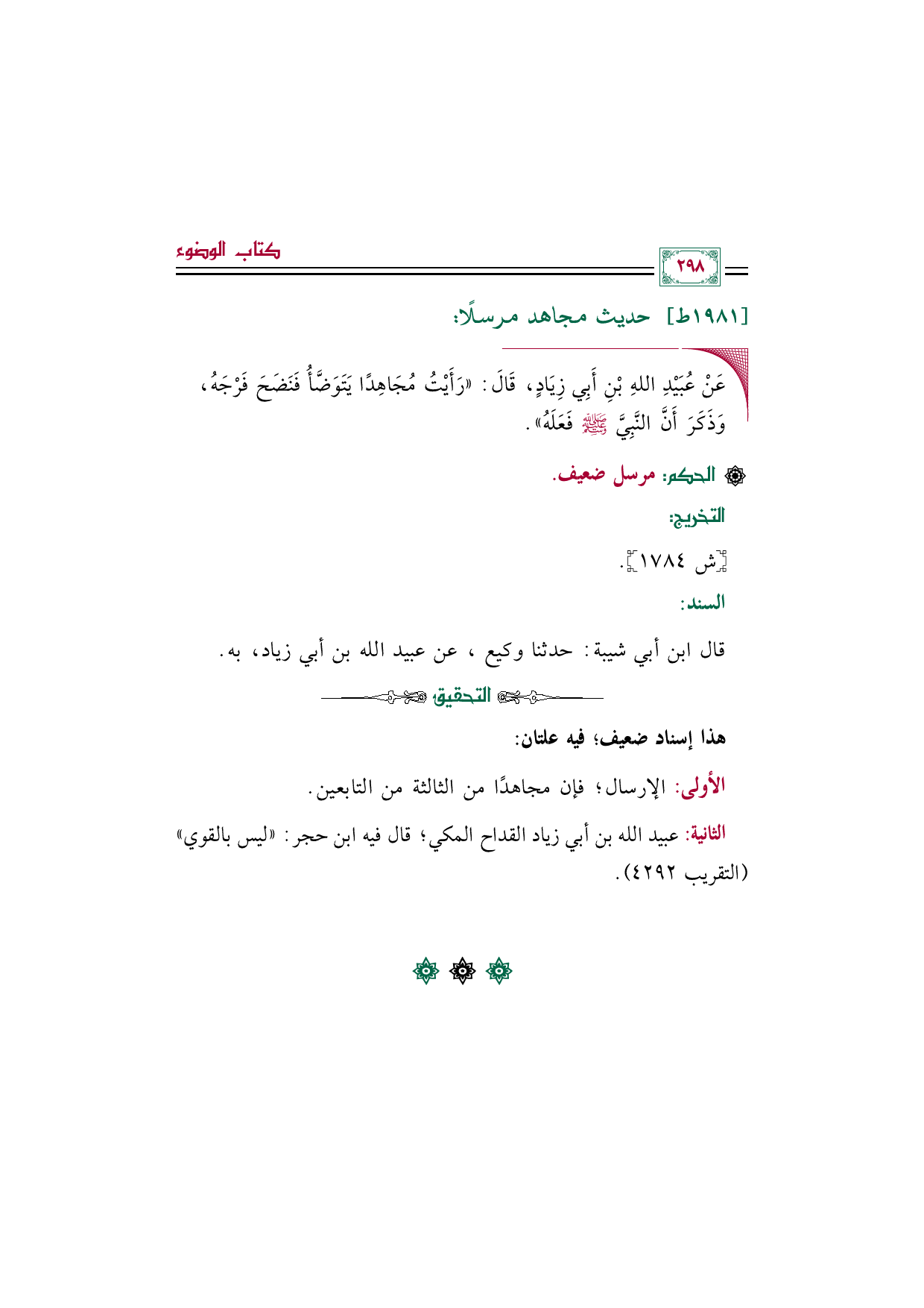 الثانية: عبيد الله بن أبي زياد القداح المكي؛ قال فيه ابن حجر: "ليس بالقوي" (التقريب ٤٢٩٢).