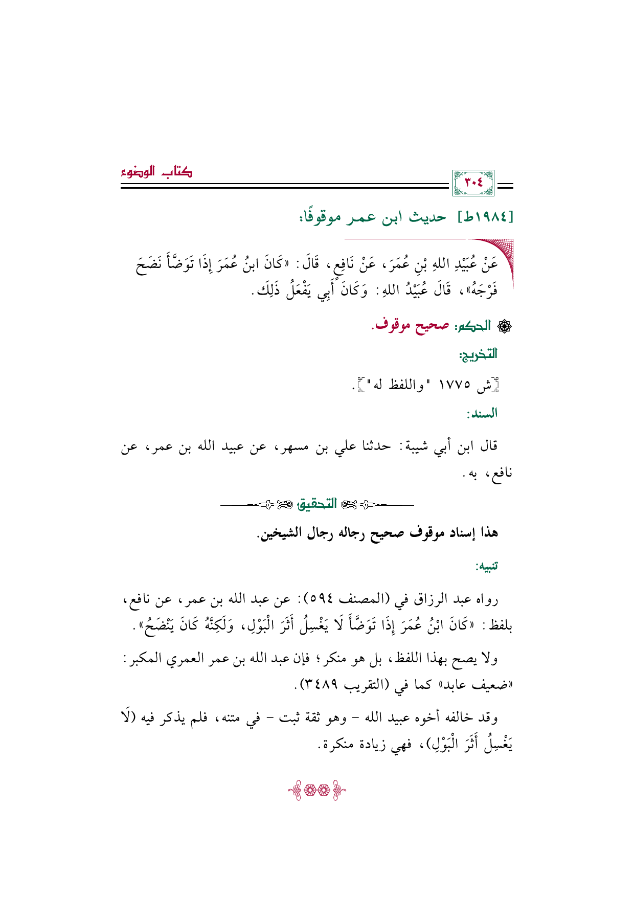 ◼ عَنْ عُبَيْدِ اللهِ بْنِ عُمَرَ، عَنْ نَافِعٍ، قَالَ: ((كَانَ ابنُ عُمَرَ إِذَا تَوَضَّأَ نَضَحَ فَرْجَهُ))، قَالَ عُبَيْدُ اللهِ: وَكَانَ أَبِي يَفْعَلُ ذَلِكَ.