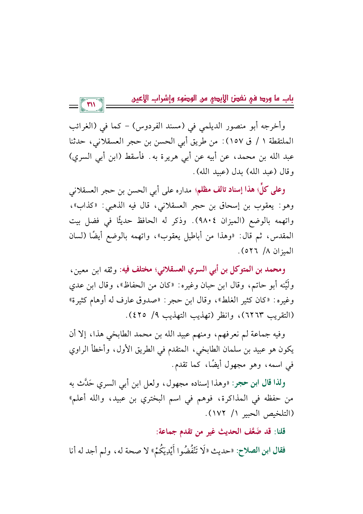 وعلى كلٍّ؛ هذا إسناد تالف مظلم؛ مداره على أبي الحسن بن حجر العسقلاني وهو: يعقوب بن إسحاق بن حجر العسقلاني، قال فيه الذهبي: "كذاب"، واتهمه بالوضع (الميزان ٩٨٠٤). وذكر له الحافظ حديثًا في فضل بيت المقدس، ثم قال: "وهذا من أباطيل يعقوب"، واتهمه بالوضع أيضًا (لسان الميزان ٨/ ٥٢٦).