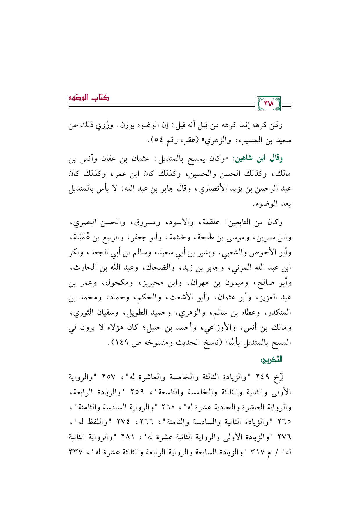 وكان من التابعين: علقمة، والأسود، ومسروق، والحسن البصري، وابن سيرين، وموسى بن طلحة، وخيثمة، وأبو جعفر، والربيع بن عُمَيْلة، وأبو الأحوص والشعبي، وبشير بن أبي سعيد، وسالم بن أبي الجعد، وبكر بن عبد الله المزني، وجابر بن زيد، والضحاك، وعبد الله بن الحارث، وأبو صالح، وميمون بن مهران، وابن محيريز، ومكحول، وعمر بن عبد العزيز، وأبو عثمان، وأبو الأشعث، والحكم، وحماد، ومحمد بن المنكدر، وعطاء بن سالم، والزهري، وحميد الطويل، وسفيان الثوري، ومالك بن أنس، والأوزاعي، وأحمد بن حنبل؛ كان هؤلاء لا يرون في المسح بالمنديل بأسًا" (ناسخ الحديث ومنسوخه ص ١٤٩).