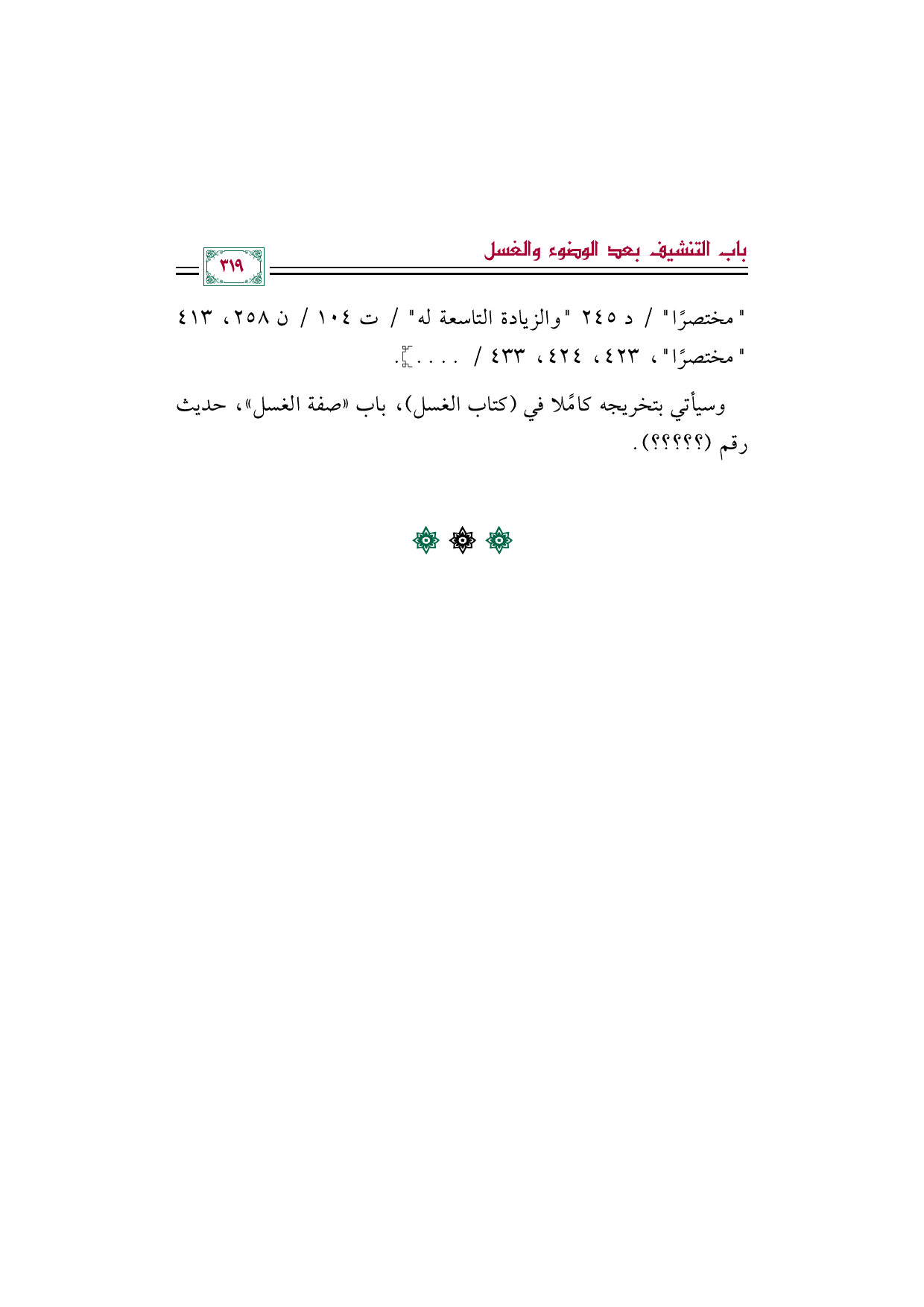 "مختصرًا" / د ٢٤٥ "والزيادة التاسعة له" / ت ١٠٤ / ن ٢٥٨، ٤١٣ "مختصرًا"، ٤٢٣، ٤٢٤، ٤٣٣ / ..... ].
