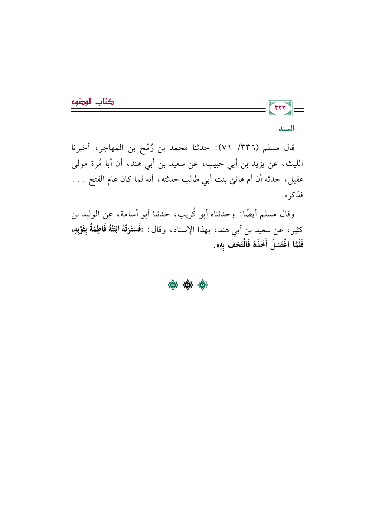 وقال مسلم أيضًا: وحدثناه أبو كُريب، حدثنا أبو أسامة، عن الوليد بن كثير، عن سعيد بن أبي هند، بهذا الإسناد، وقال: ((فَسَتَرَتْهُ ابْنَتُهُ فَاطِمَةُ بِثَوْبِهِ، فَلَمَّا اغْتَسَلَ أَخَذَهُ فَالْتَحَفَ بِهِ)).
